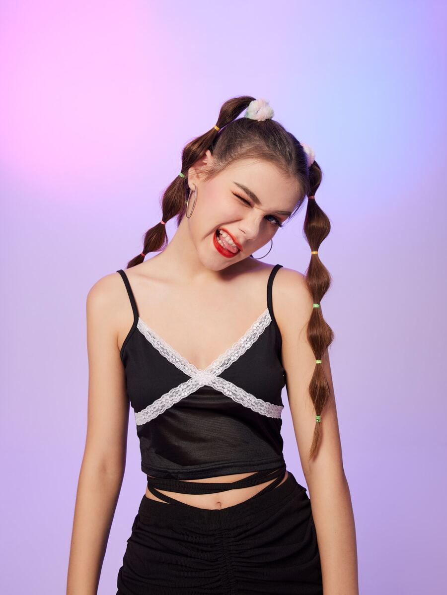 Top con bretelle sottile color block Pizzo a contrasto con lacci