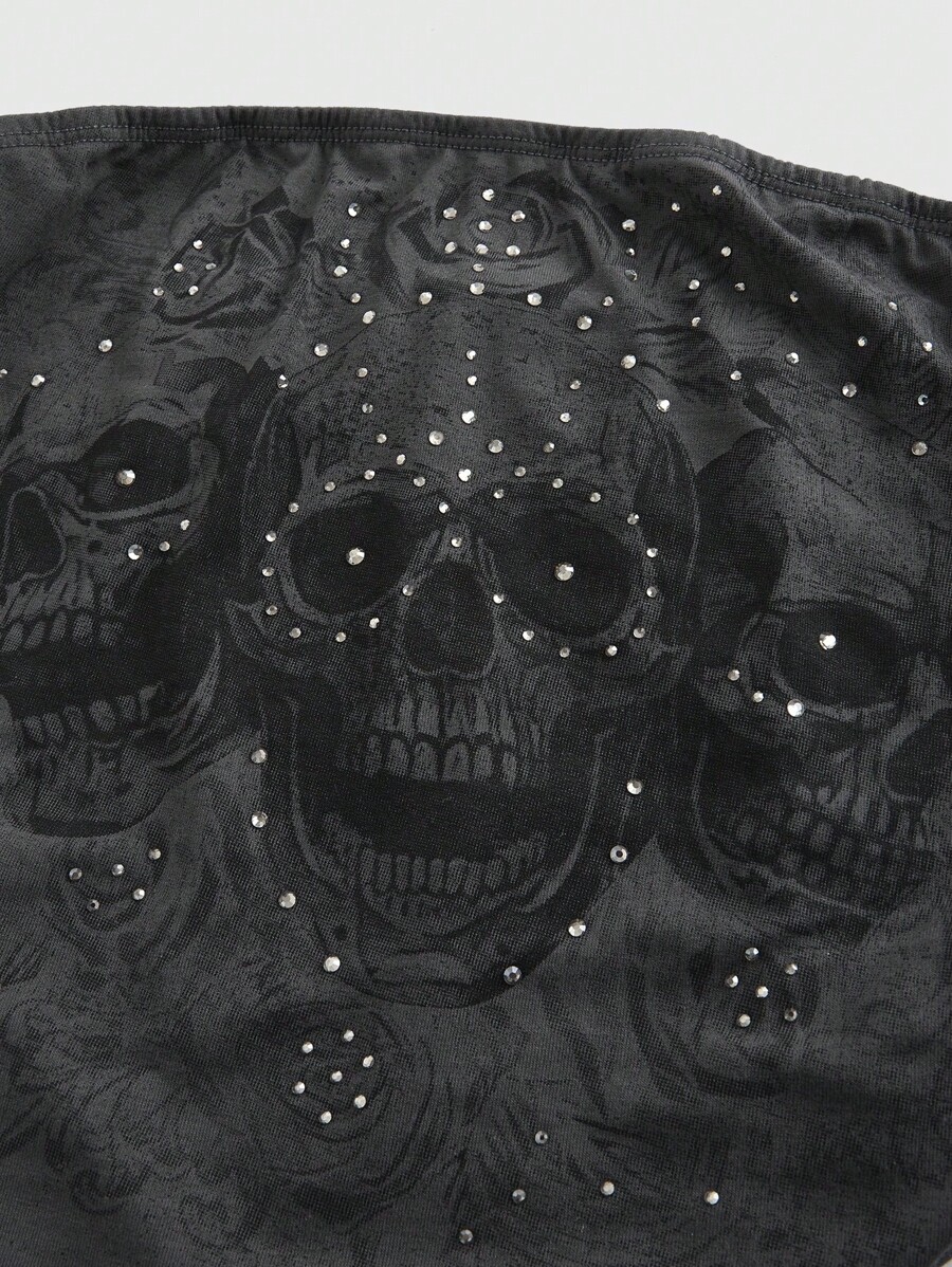 Goth Top senza spalline donna con elementi di teschi gotici scuri e rose tinti con decorazioni di strass