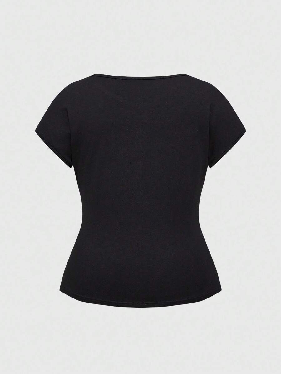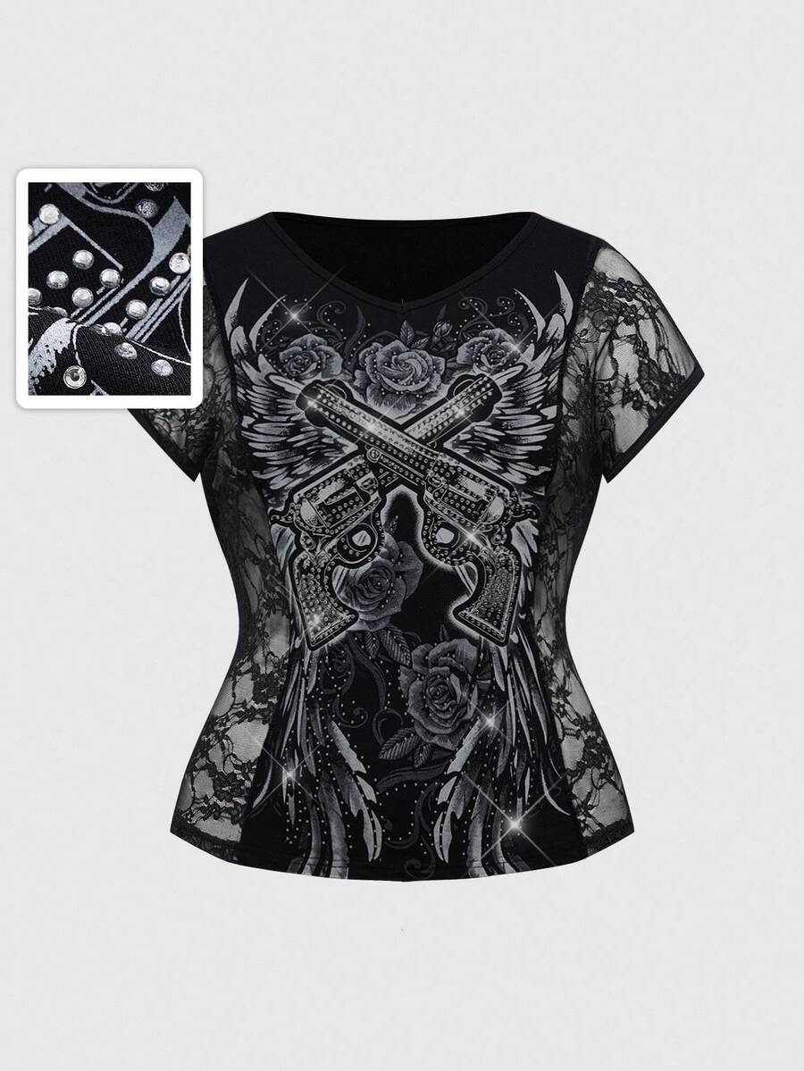Goth Blusa taglie forti con stampa di pistola scura e vite, patch in pizzo e strass