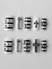 10 pezzi di unghie finte stile punk con borchie a croce + 3 pezzi di nastro biadesivo, motivo a lettere bianco e nero stile Y2K, elementi geometrici per manicure stile Y2K, unghie quadrate medie rimovibili e riutilizzabili adatte per uso quotidiano e appuntamenti