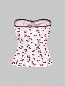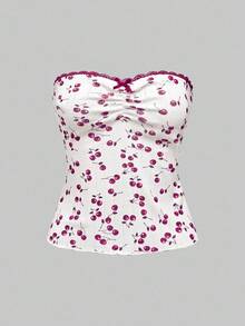 Kawaii Top aderente da donna con stampa a ciliegie su tutto il capo, con arricciature, fiocco e dettagli in pizzo, ideale per vacanze e momenti sexy