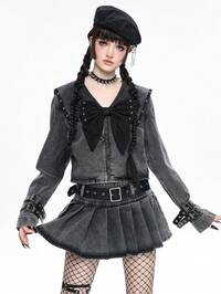 Goth Giacca e cappotto di jeans da donna con colletto navy e fiocco decorativo