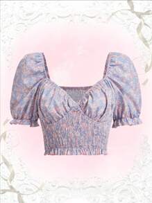 Camicetta con stampa fiorellini con manica a sbuffo corto arricciato
