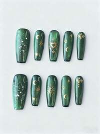 Kawaii 10 pezzi di elementi a forma di occhio di gatto, stella e luna in stile bohémien fatti a mano + 3 pezzi di nastro biadesivo per unghie, set di unghie finte a forma di occhio di gatto di tipo a bara lunga in colori verde e nero, manicure di alta qualità con colori contrastanti dipinti a mano, pezzi per unghie riutilizzabili adatti per uso quotidiano, feste e balli.