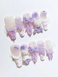 Kawaii Unghie finte a forma di cofano con fiocco grande in pizzo stile romantico francese Y2K, realizzate a mano