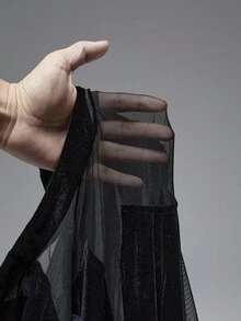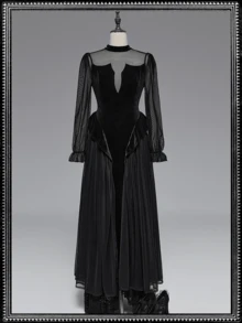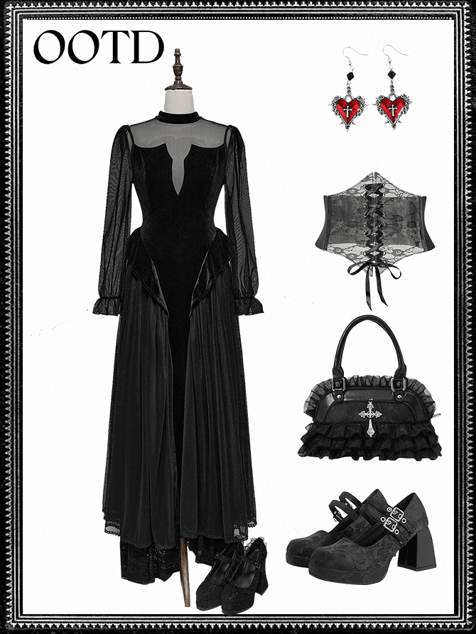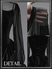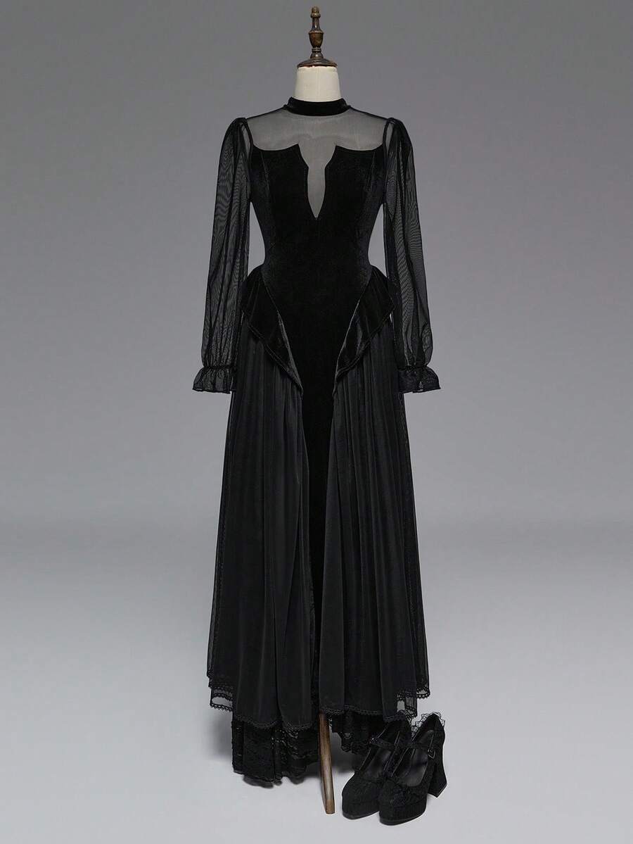 EDITION Abito lungo da donna in stile gotico con maniche lunghe, rouches, lacci e inserti in rete, adatto per Ognissanti