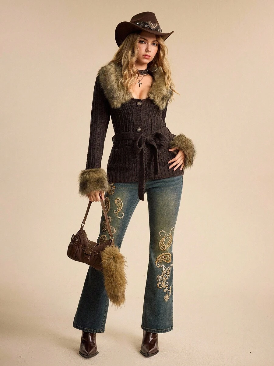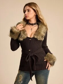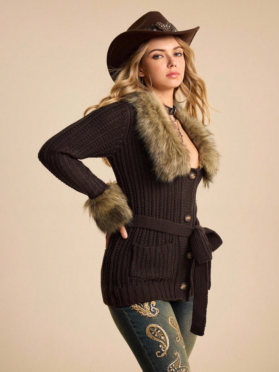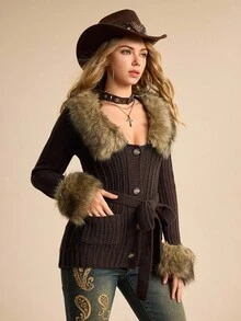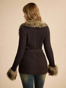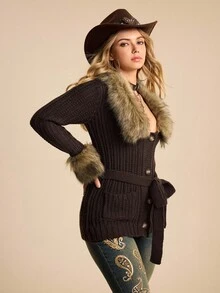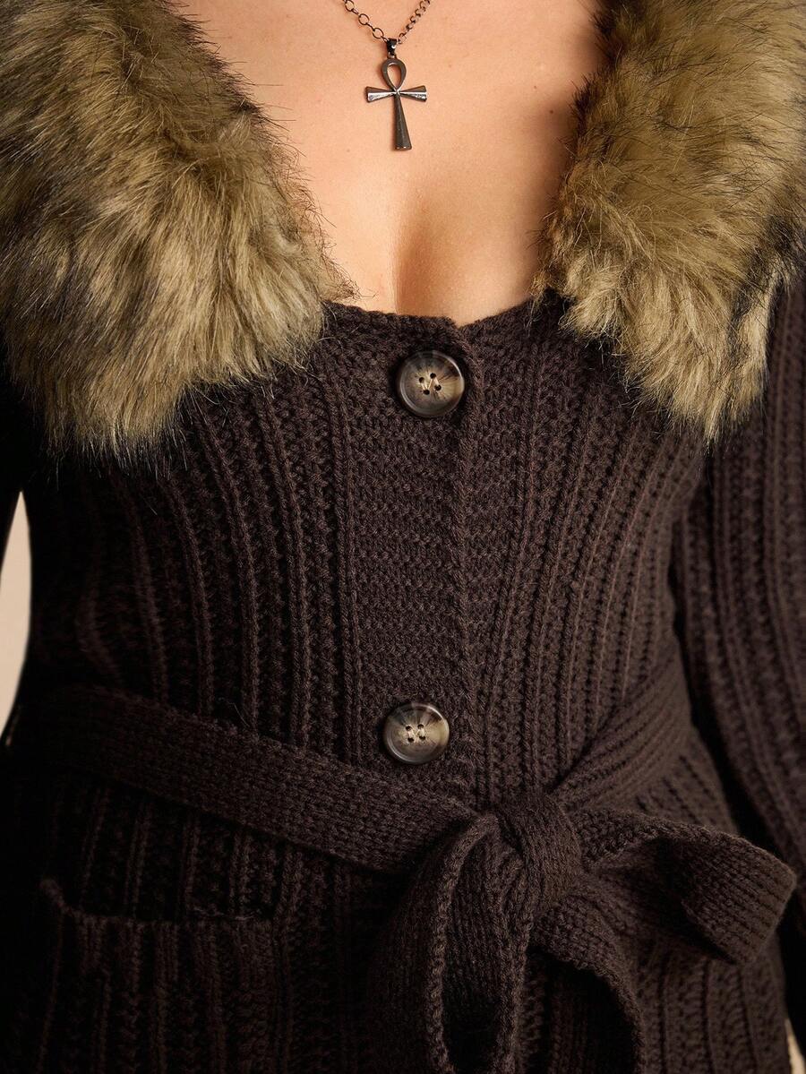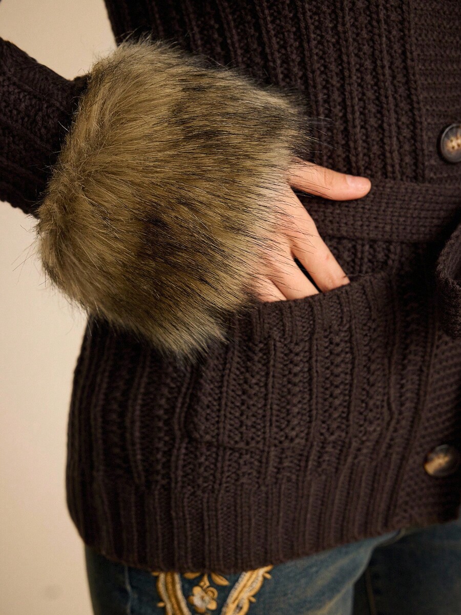 EDITION Cardigan lavorato a maglia con colletto in pelliccia, manica lunga, monopetto, aderente, di moda, adatto per l'autunno/inverno da donna