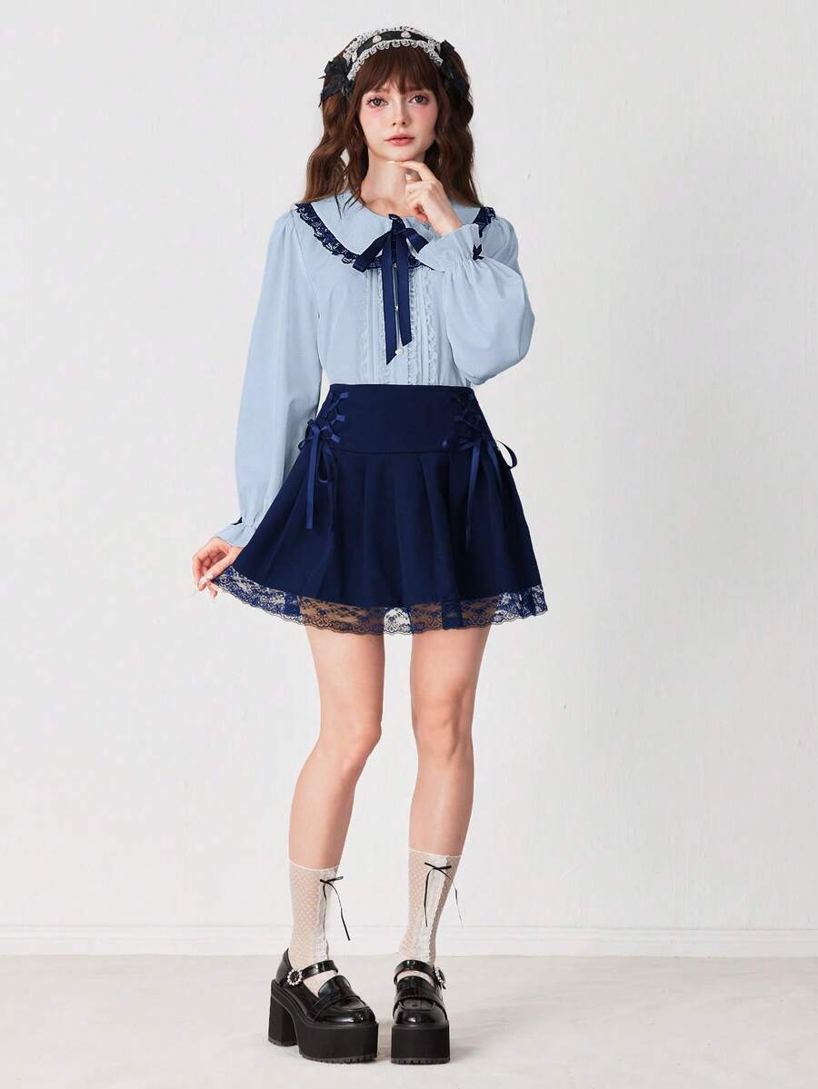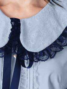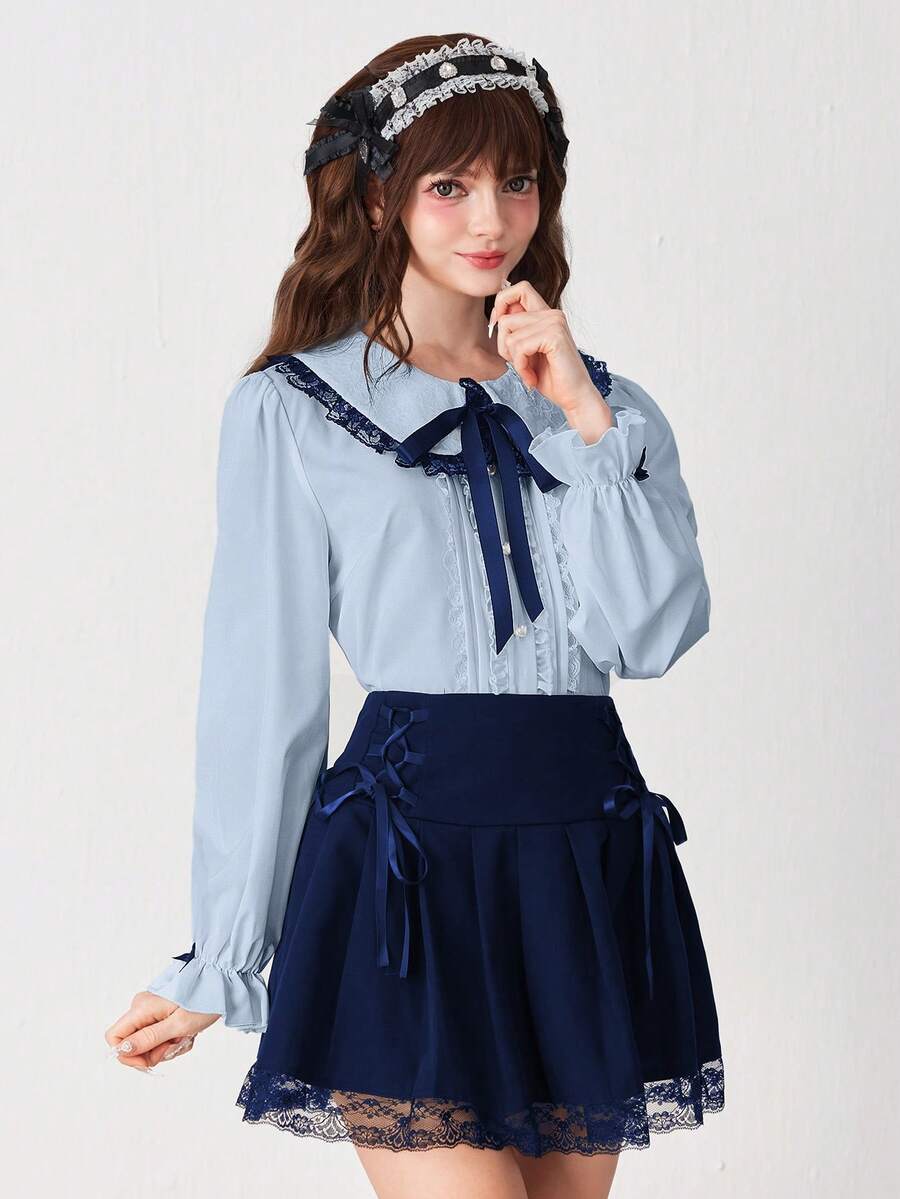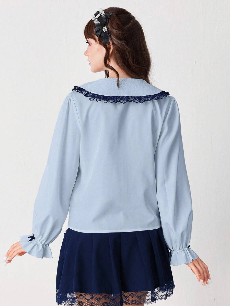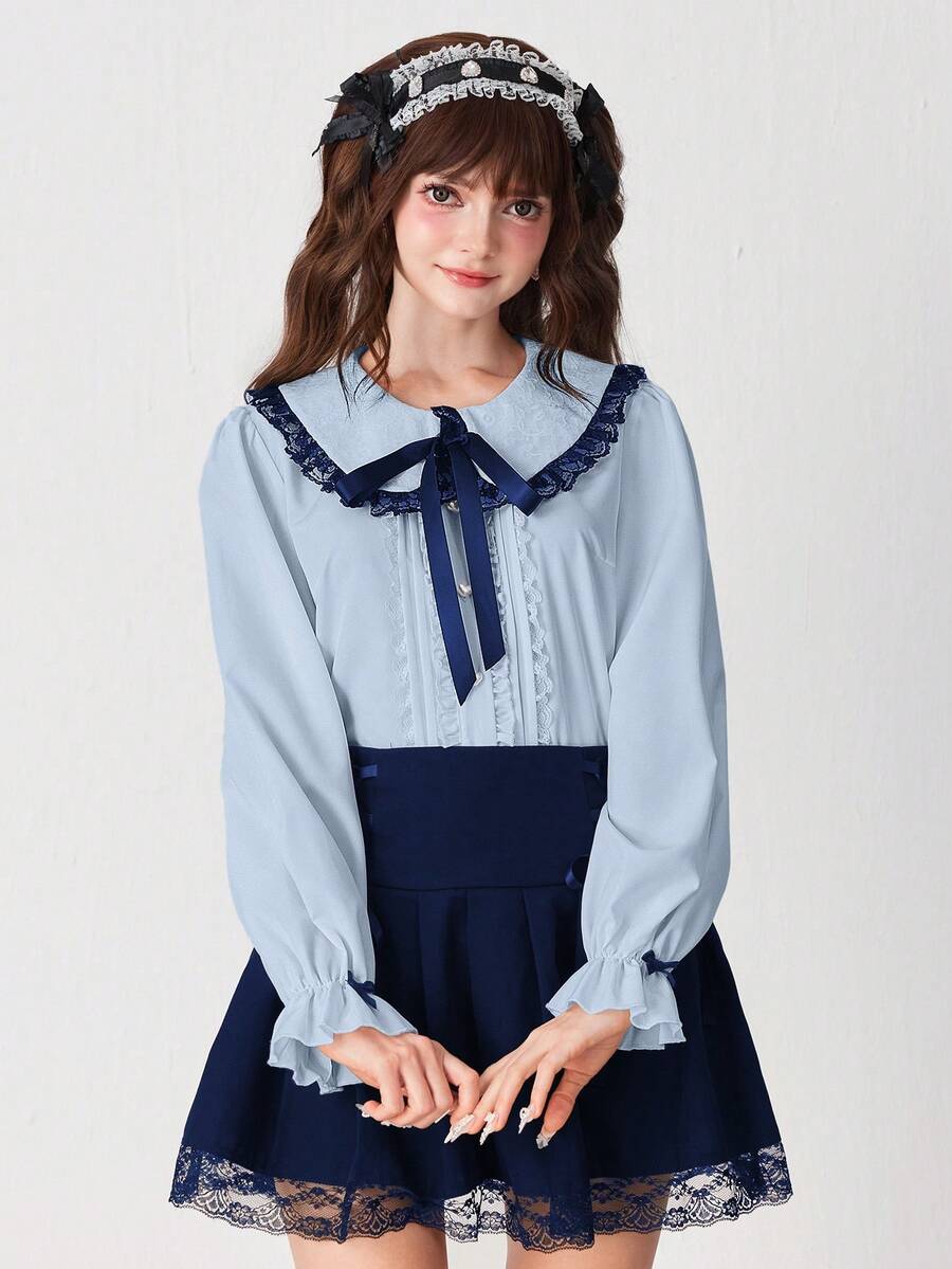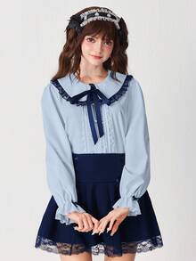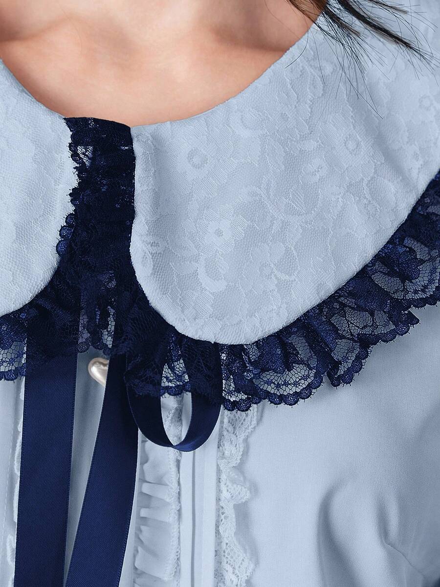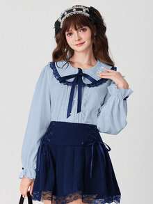 EDITION Blusa da donna con colletto Peter Pan, arricciatura in pizzo e fiocco al collo, maniche lunghe