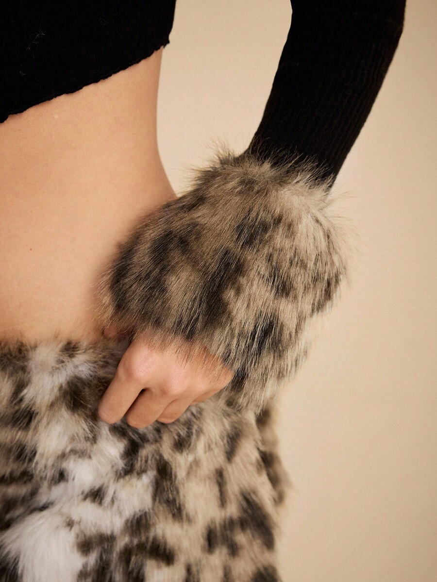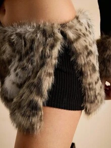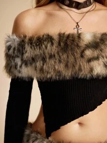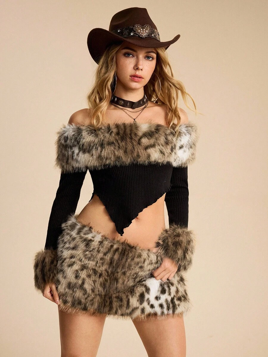 EDITION Top da donna con collo a canottiera, in stile Y2K, Harajuku, Gyaru, con stampa leopardata e inserti in pelliccia, abbinato a una minigonna sexy in vita bassa con stampa leopardata e pelliccia, adatta per l'autunno/inverno