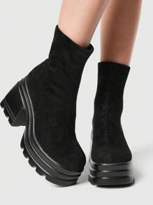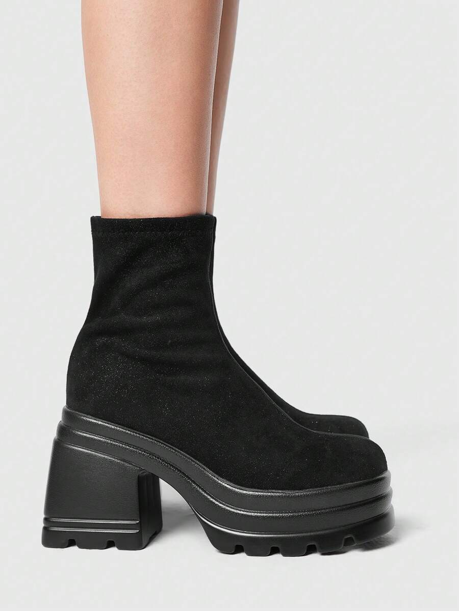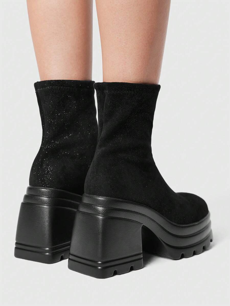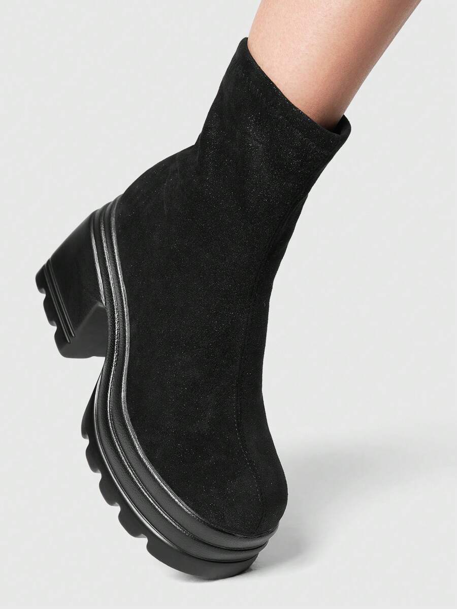 Stivaletti neri a calzata rapida di stile europeo e americano con tacco a zeppa, suola spessa, stile gotico, con strass luccicanti, adatti per abiti da festa, stivaletti corti e alla caviglia da donna per Natale, Capodanno, autunno e inverno