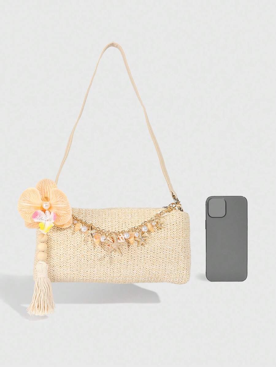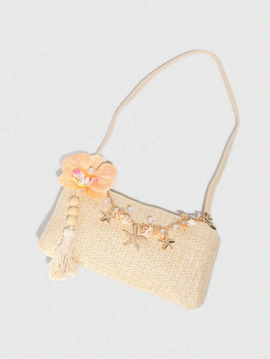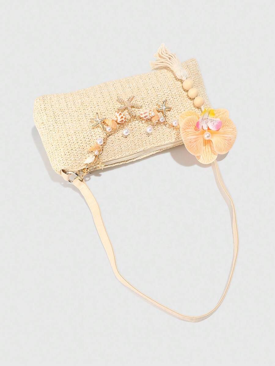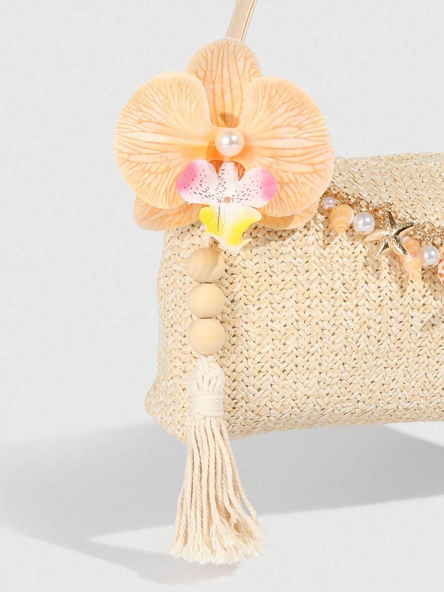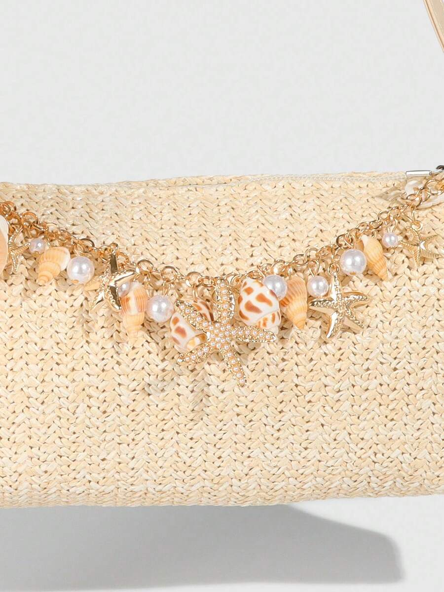 Fairycore 1 pezzo Borsa a secchiello in paglia decorata con catene e elementi marittimi di ispirazione tropicale, borsa a spalla con decorazioni di farfalle e fiori