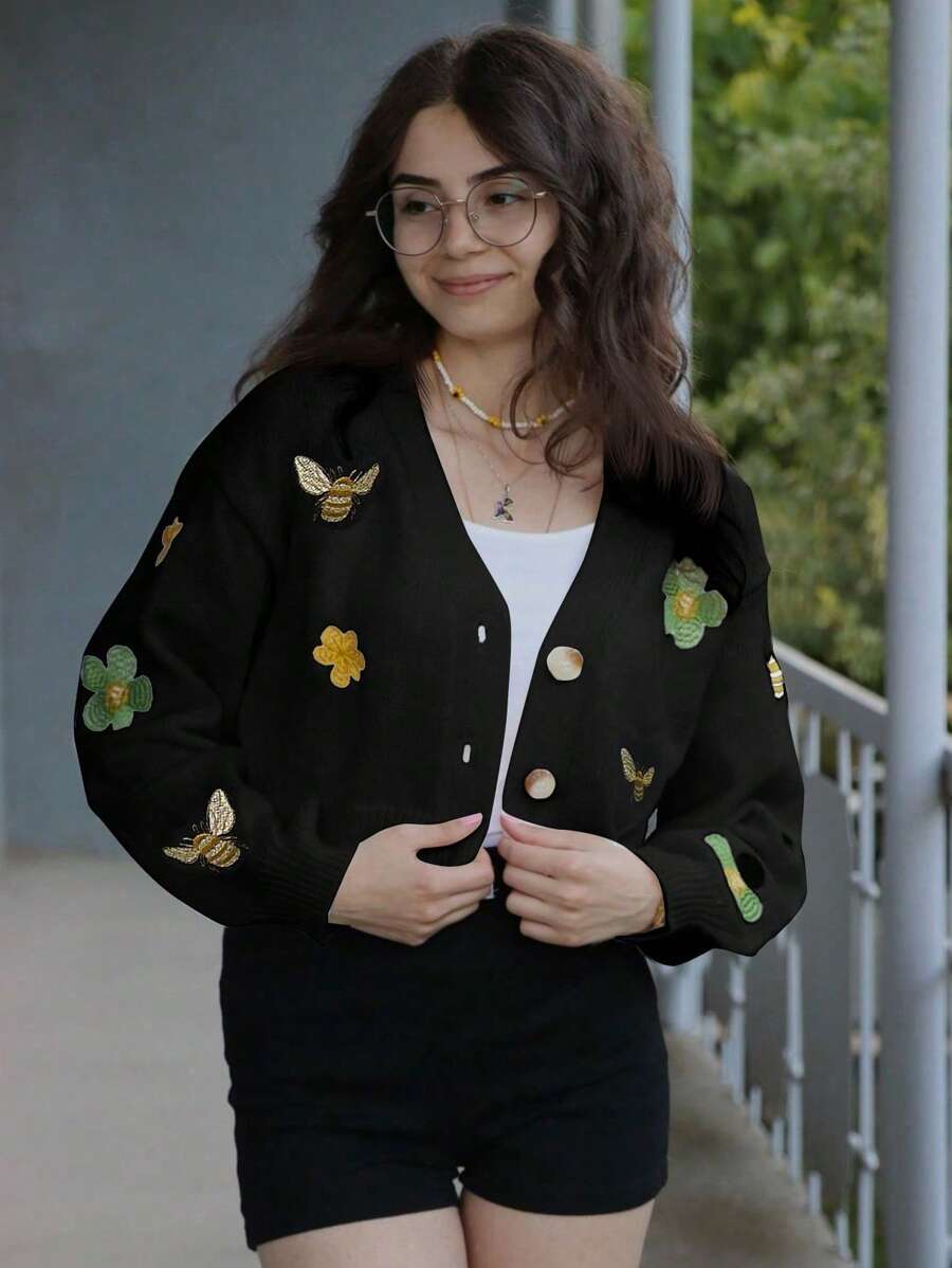 Fairycore Cardigan casual quotidiano con bottoni anteriori, ricamato con fiori e api, adatto per autunno/inverno