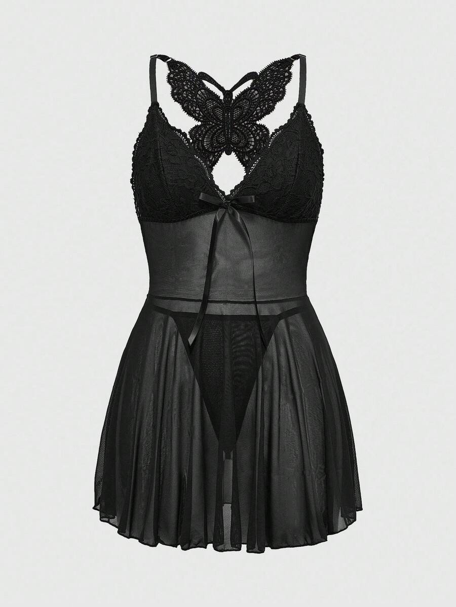Set da notte e vestaglia da donna in pizzo e rete a patchwork, motivo farfalla idrosolubile, stile Fairycore, sexy