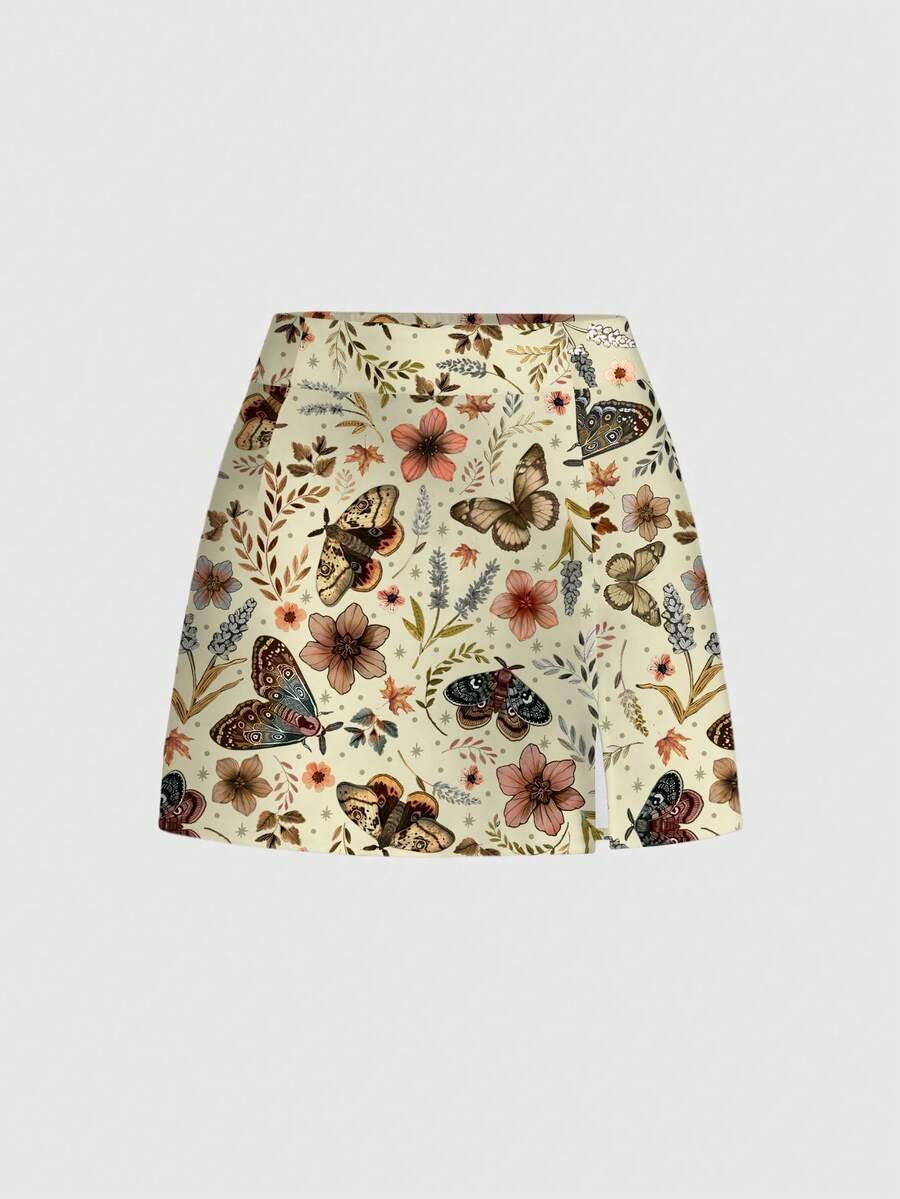 Fairycore Minigonna con stampa floreale e vegetale di una foresta oscura e misteriosa, con spacco laterale, per donna