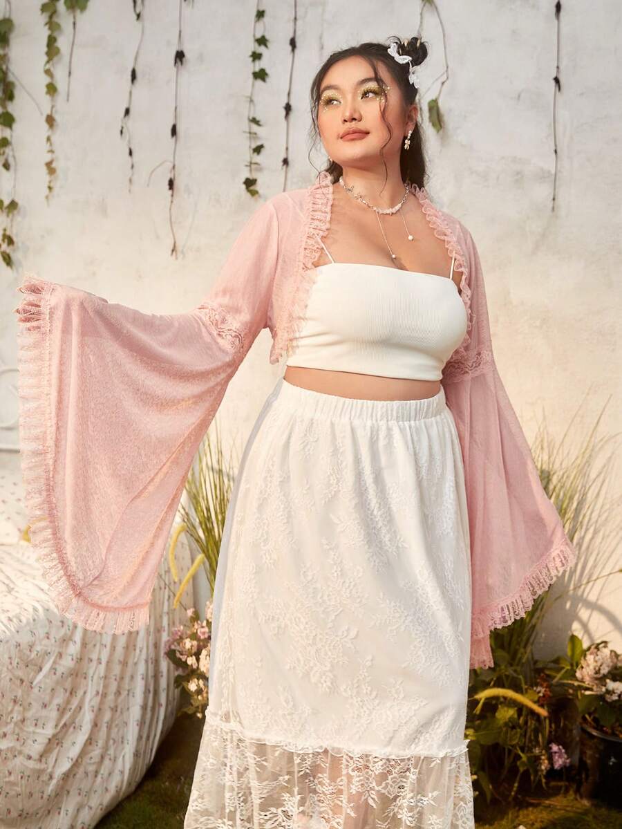 Fairycore Taglie Forti Top corto maniche a campana con bordo a volant aperto davanti