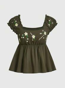 Fairycore Top taglie forti con scollo quadrato ricamato floreale e orlo a volant per donne, maniche corte, estate
