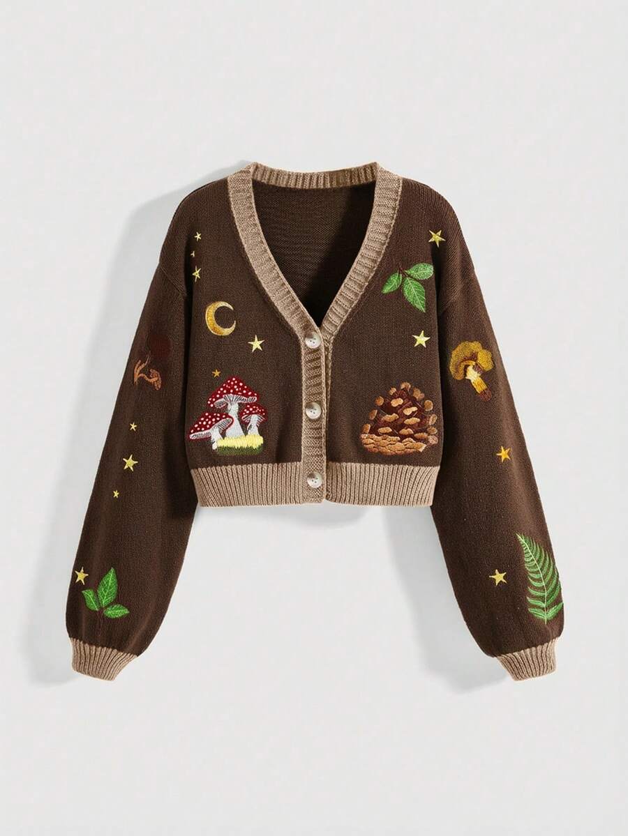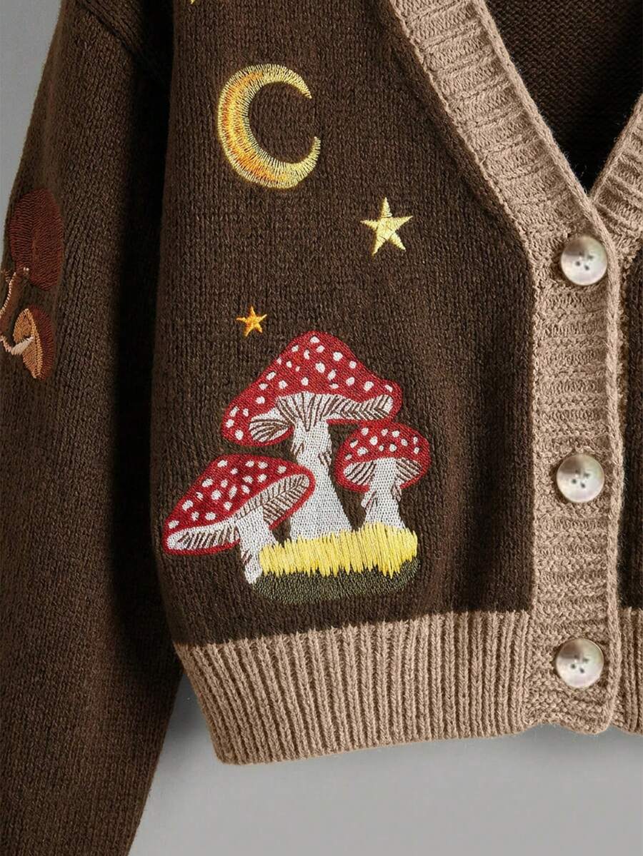 Fairycore Cardigan vintage da donna con scollo a V, abbottonato, a maniche lunghe, con ricami di funghi, piante, luna e stelle