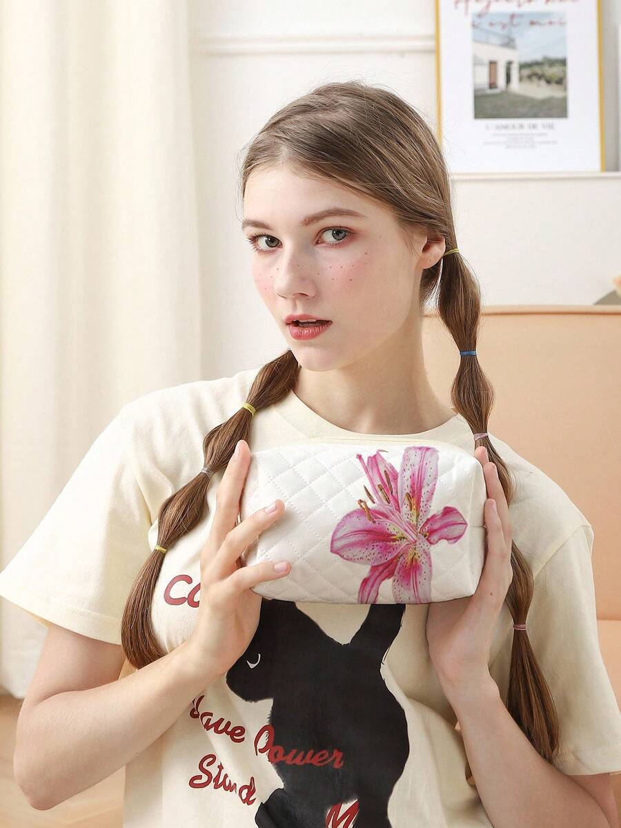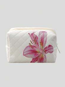 Fairycore Borsa per il trucco a forma di ottogono e rombo con stampa a fiori di giglio rosa su base bianca