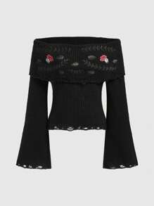 Fairycore Maglione da donna con maniche a campana, scollo alla spalla e motivo a viticcio di funghi