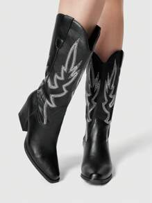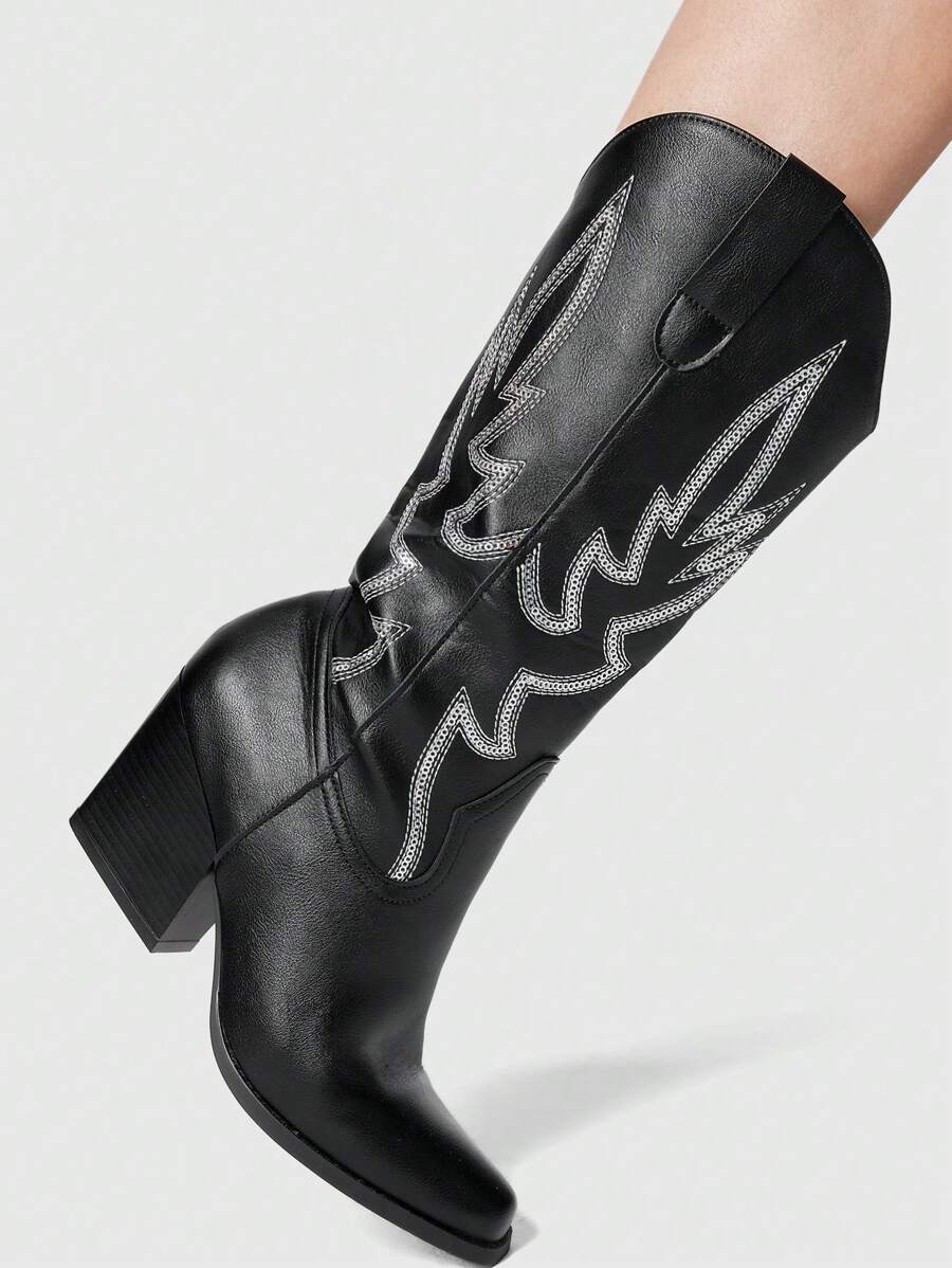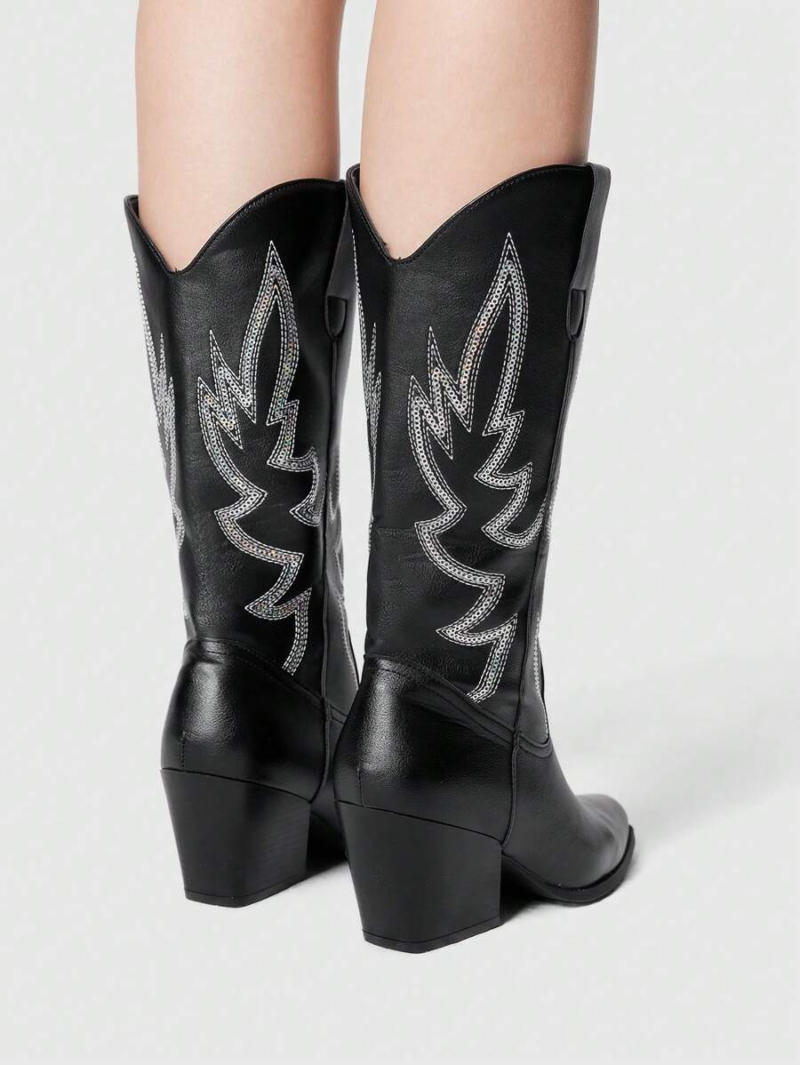 Fairycore Stivali da cowgirl asimmetrici in pelle da donna con ricamo e paillettes, stivali midi per la primavera e l'autunno