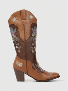 Fairycore Stivali da cowgirl marroni da donna, slip-on, con blocchi di colore e ricami, stivali western alla moda casual da esterno, stivali alti da equitazione