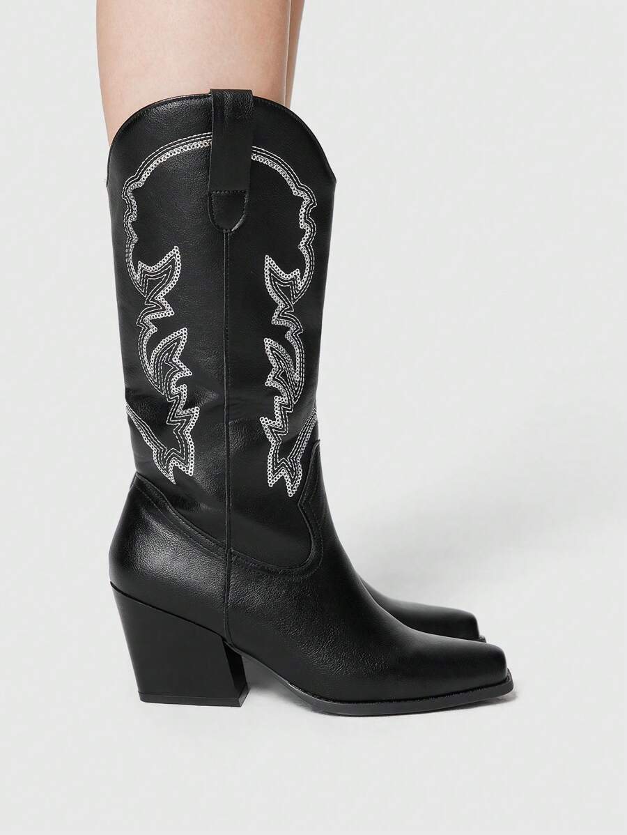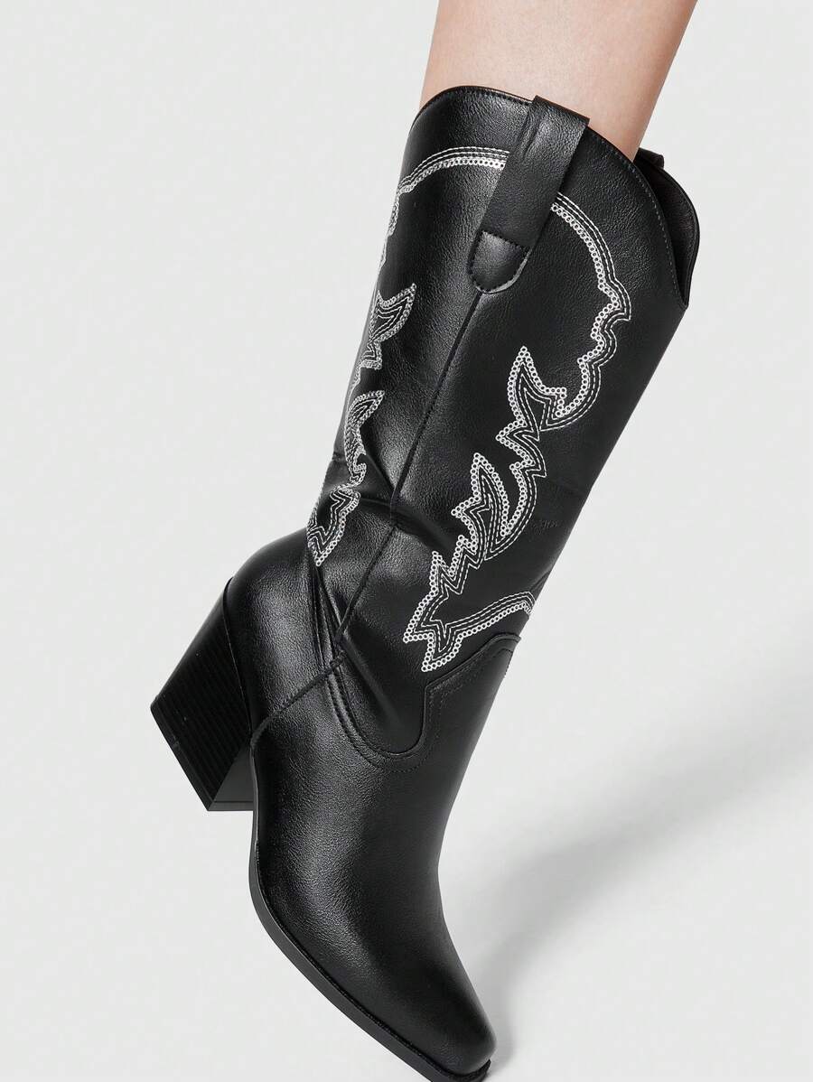 Fairycore Stivali da cowgirl in stile occidentale con punta affusolata, tacco massiccio, ricamo e paillettes, in pelle PU, sopra la caviglia, di moda per la primavera/autunno, con vestibilità slip-on