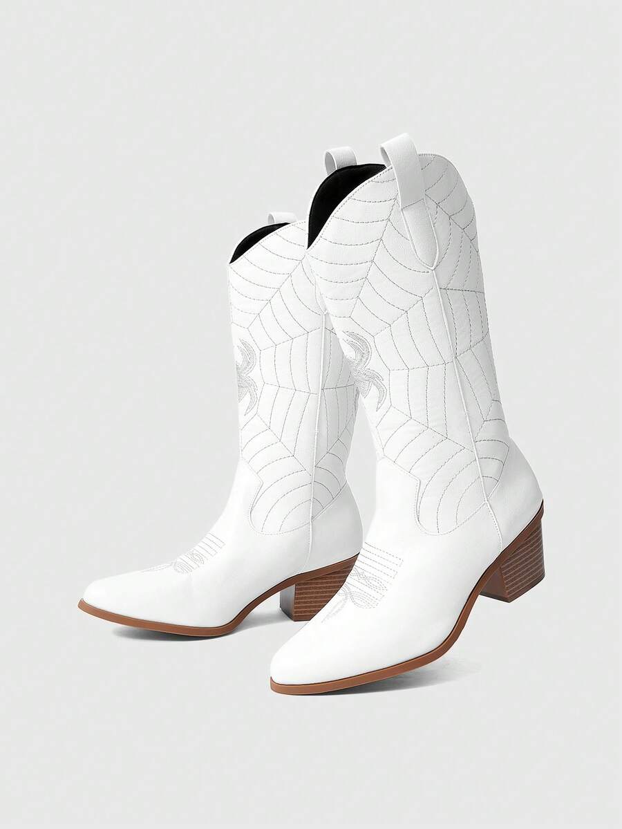 Fairycore Stivaletti alla caviglia in pelle PU con tacco largo, punta affusolata, stile punk bianco e nero ricamato con ragno, adatti per uso quotidiano, stile punk dark, campus