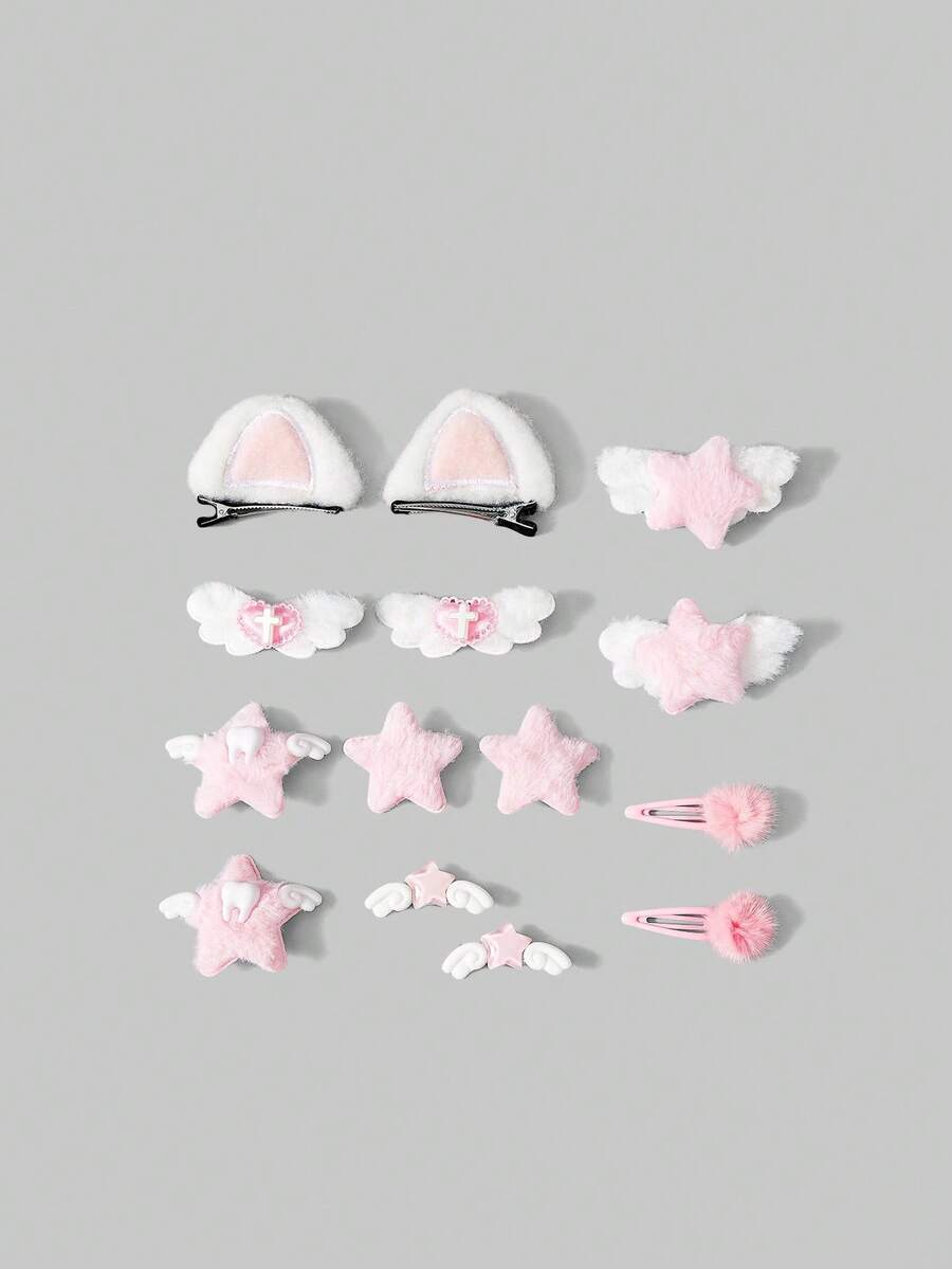 Goth 14 stili casuali di forcine fatte a mano, con fiori rosa, stelle a forma di pallina, orecchie di gatto, ali d'amore, combinazione di elementi a forma di stella, vento carino, forcine per capelli soffici e spettinati, combinazione di accessori per capelli.