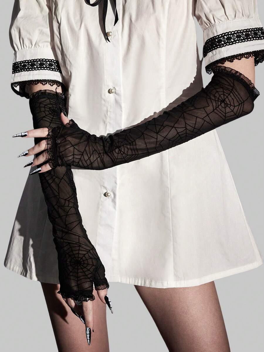 Goth 1 paio di Guanti di pizzo traspiranti anti-UV con motivo di ragnatela gotica per feste e + 1 pezzo di Bracciale rosa stile punk con stella e catene