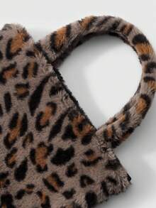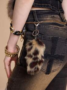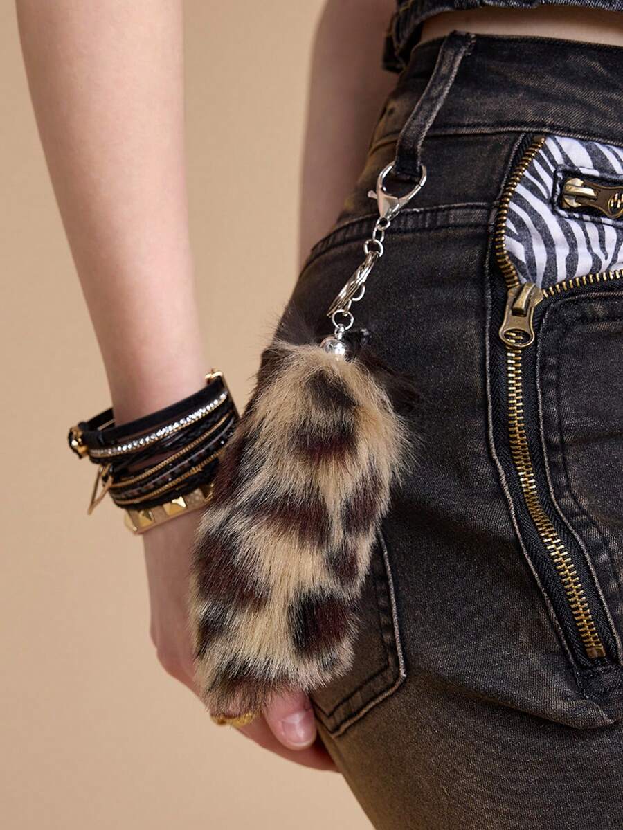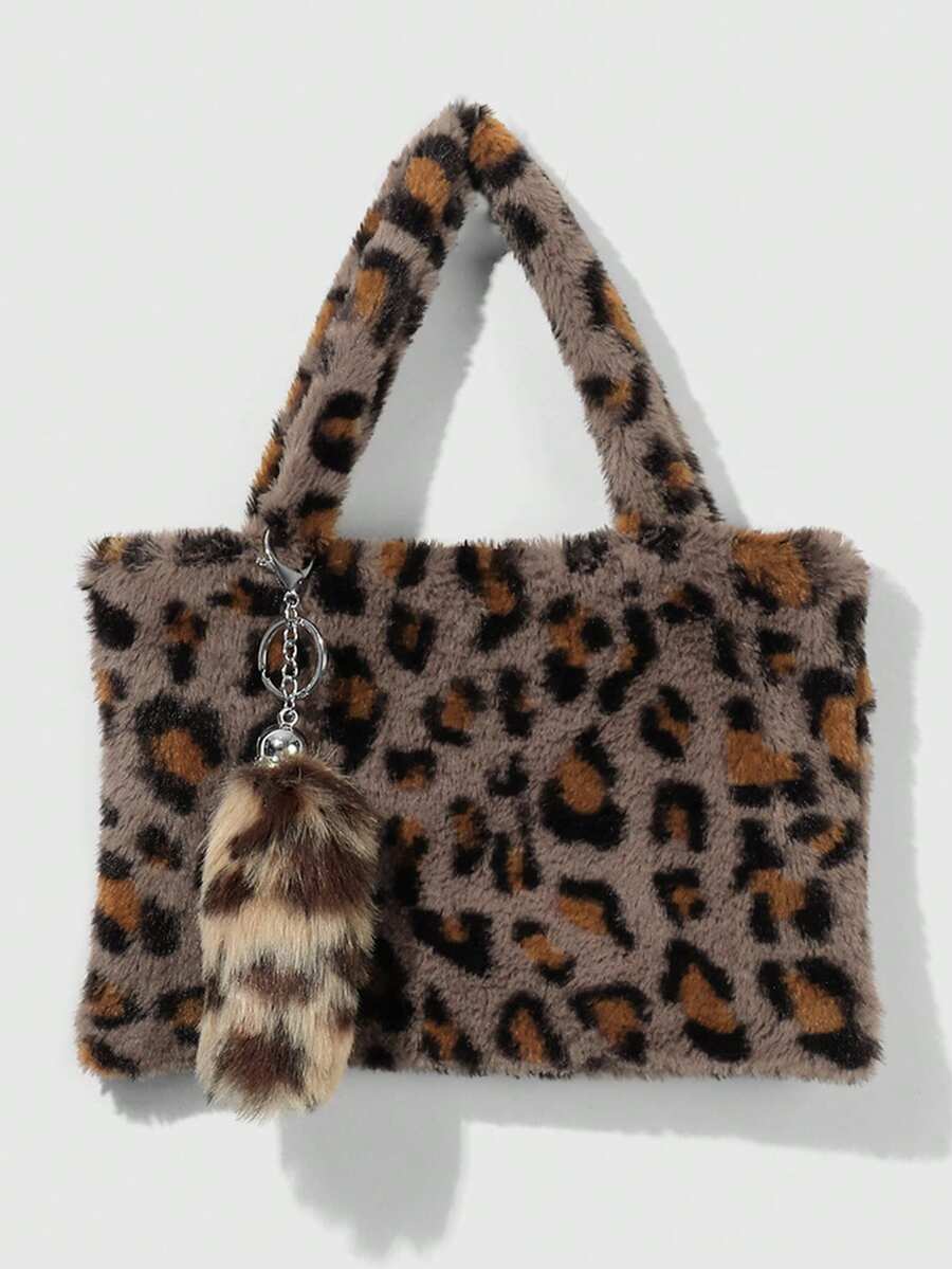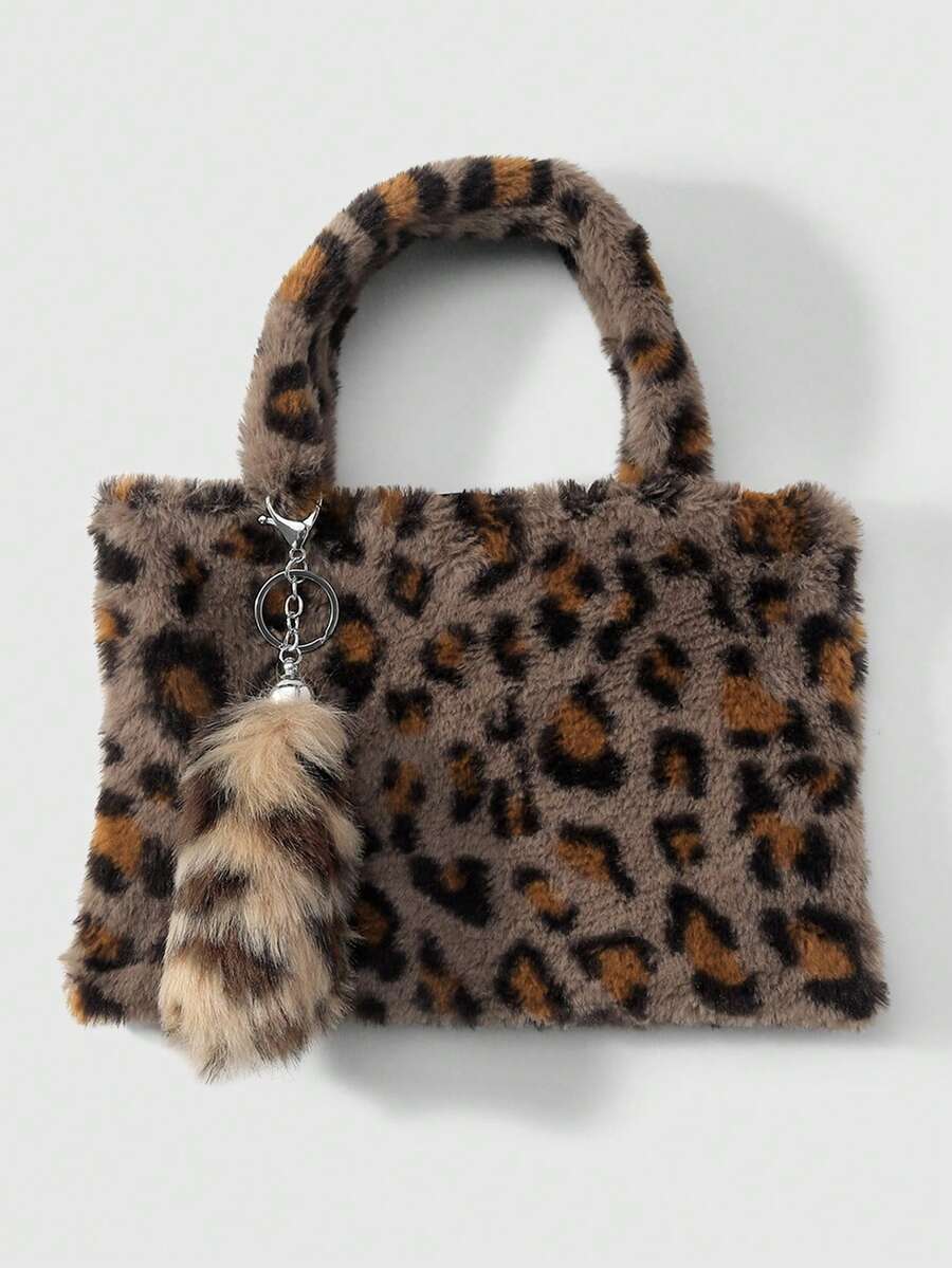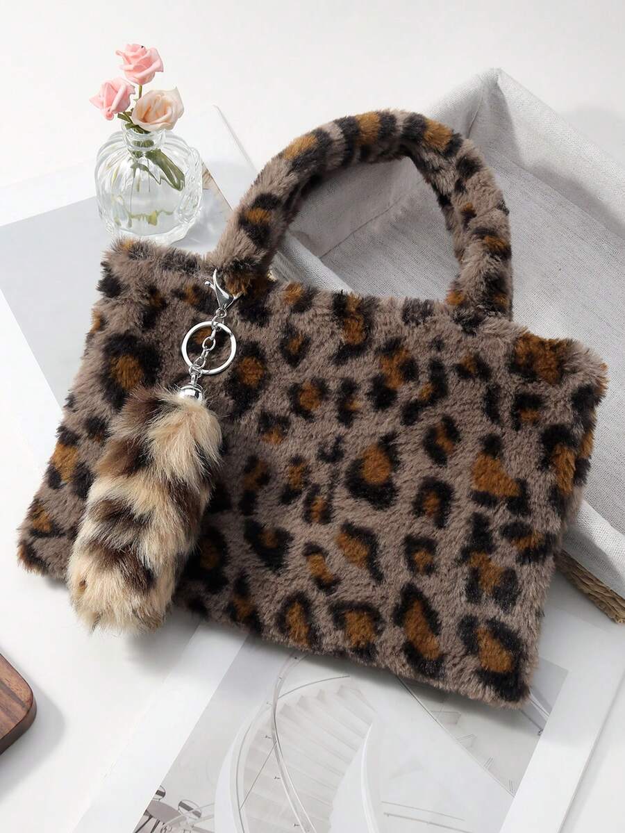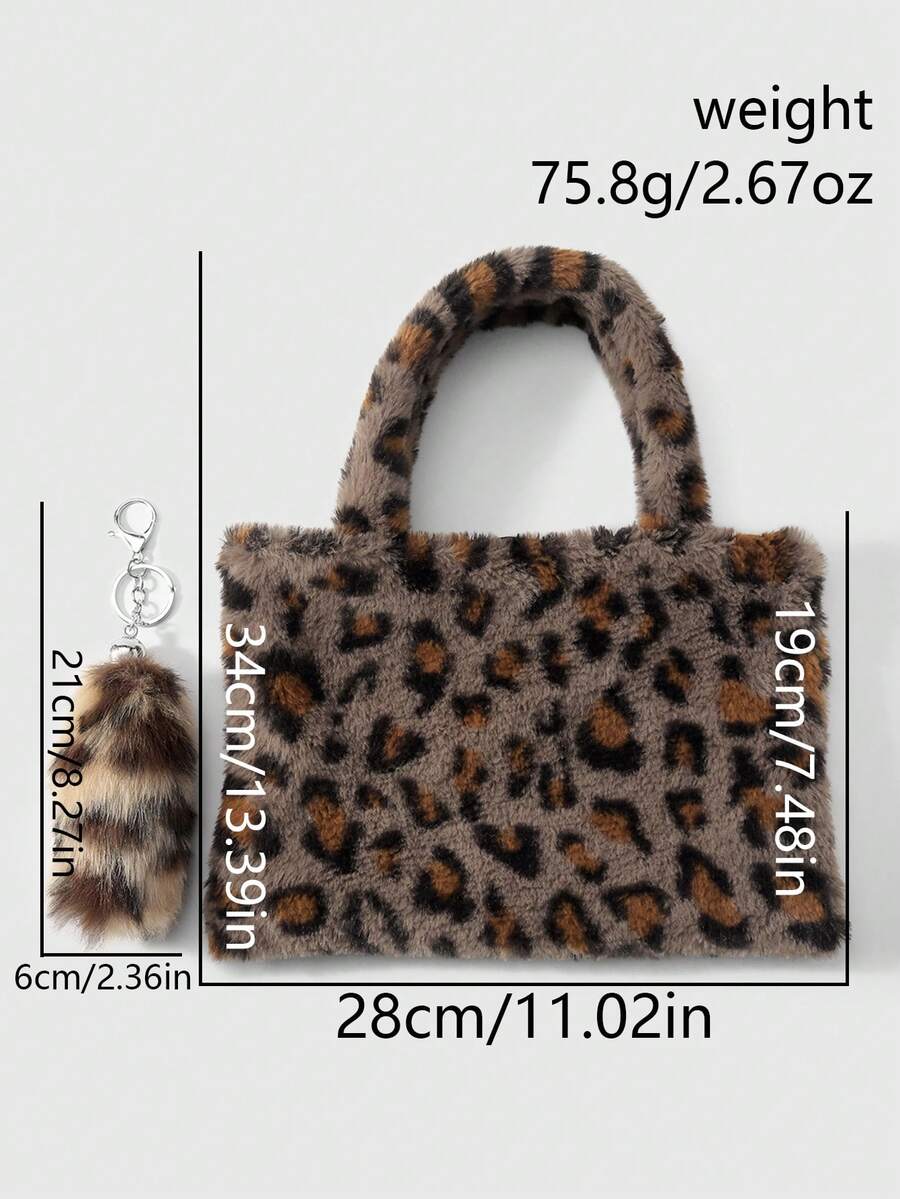 Goth 2 pezzi Set combo: Borsa casual e versatile della serie Maillard, con stampa animalier leopardo e tigre in pelliccia di coniglio sintetica, adatta per l'uso quotidiano e come regalo, + Portachiavi a forma di coda di leopardo in pelliccia sintetica marrone, adatto per le donne, per uso quotidiano e come regalo