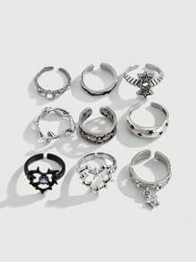 Goth Set da 9 pezzi di anelli casual alla moda punk, a forma di stella e cuore, ideale come regalo per le vacanze