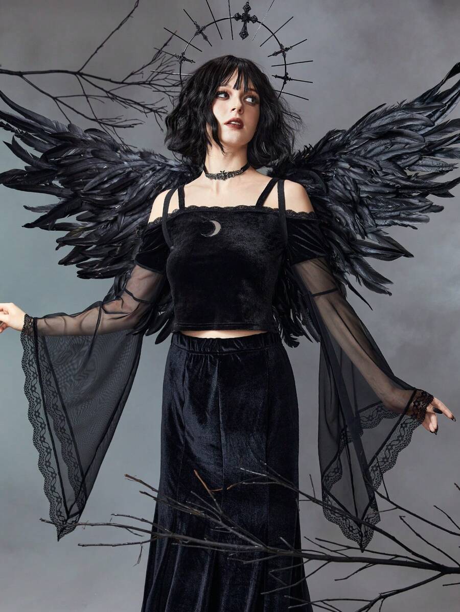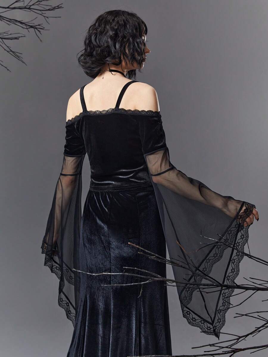 Goth Maglietta A Maniche Corte Di Velluto A Coste, Con Spalle Scoperte, Collo A Contrasto, Maniche A Campana In Maglia A Rete