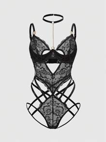 Goth Tuta intima con catena metallica e pizzo di stile gotico scuro, con reggiseno a fascia, scollo a V e apertura all'inguine sexy