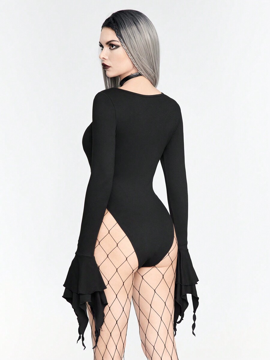 Goth Body femminile con scollo a V profondo e maniche a campana con allacciatura in pizzo