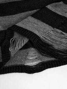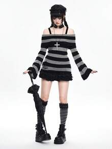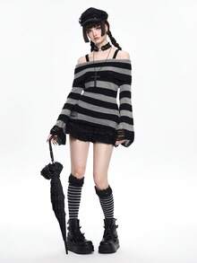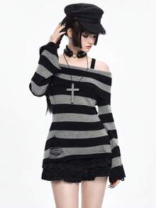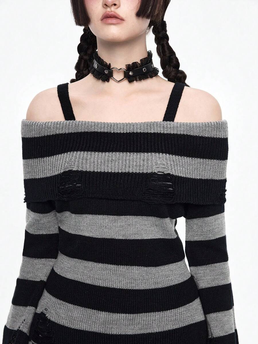 Goth Maglione alla moda a righe nere e grigie con spalle scoperte, design punk scuro e consumato, vita stretta