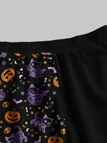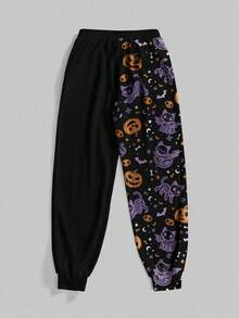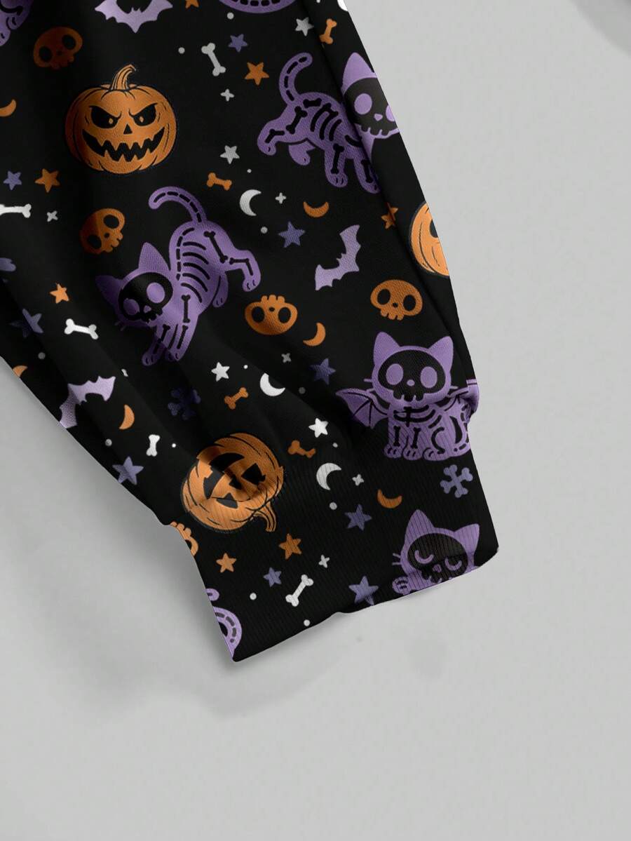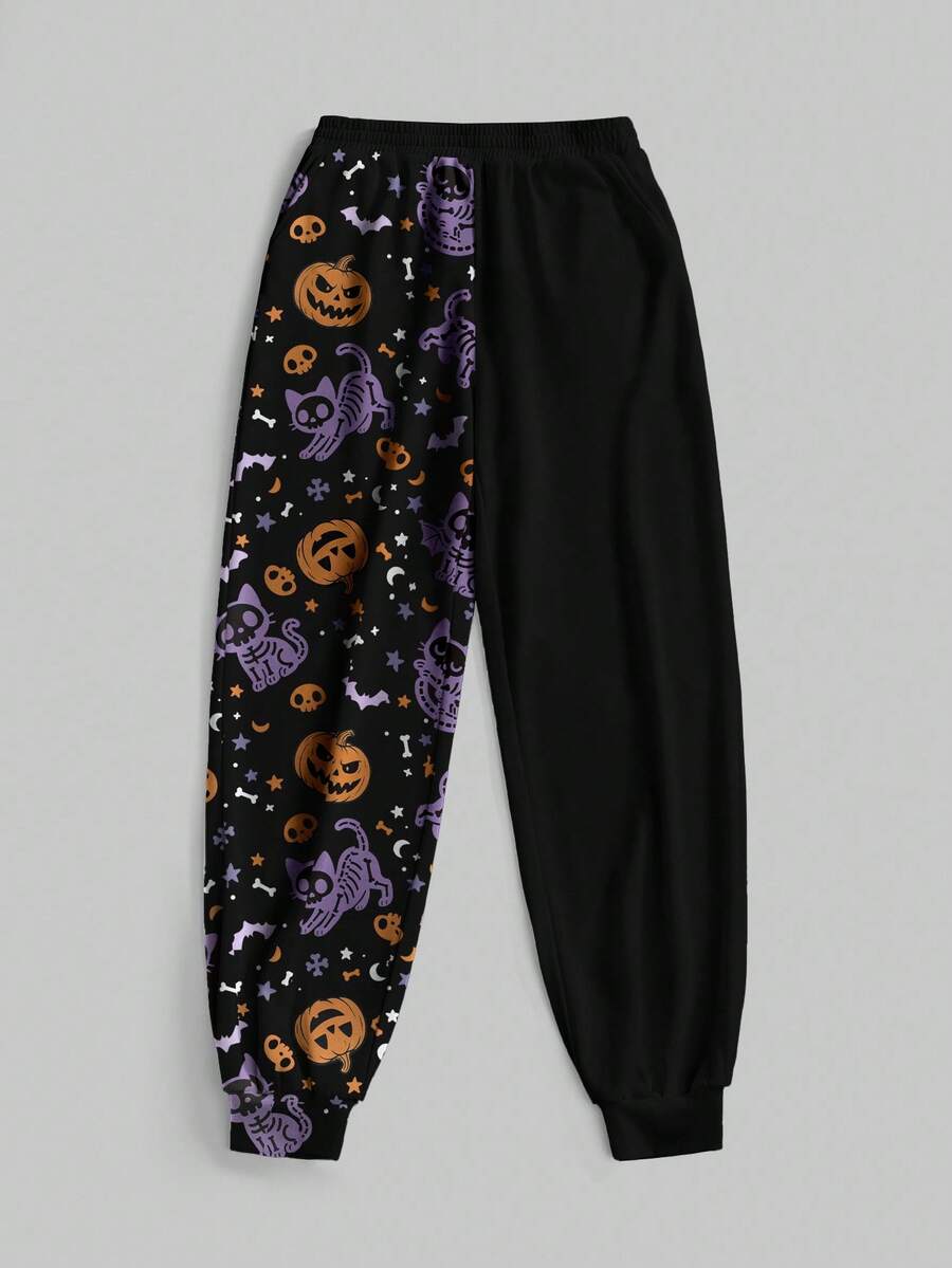Goth Pantaloni della tuta da donna in stile gotico, con stampa integrale di zucche di Ognissanti scure, colori a contrasto viola e arancione, fantasmi, gatti, teschi e stelle, in stile casual da strada