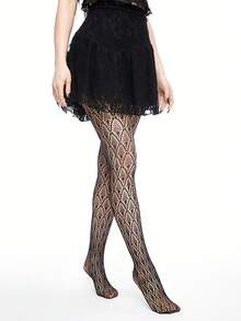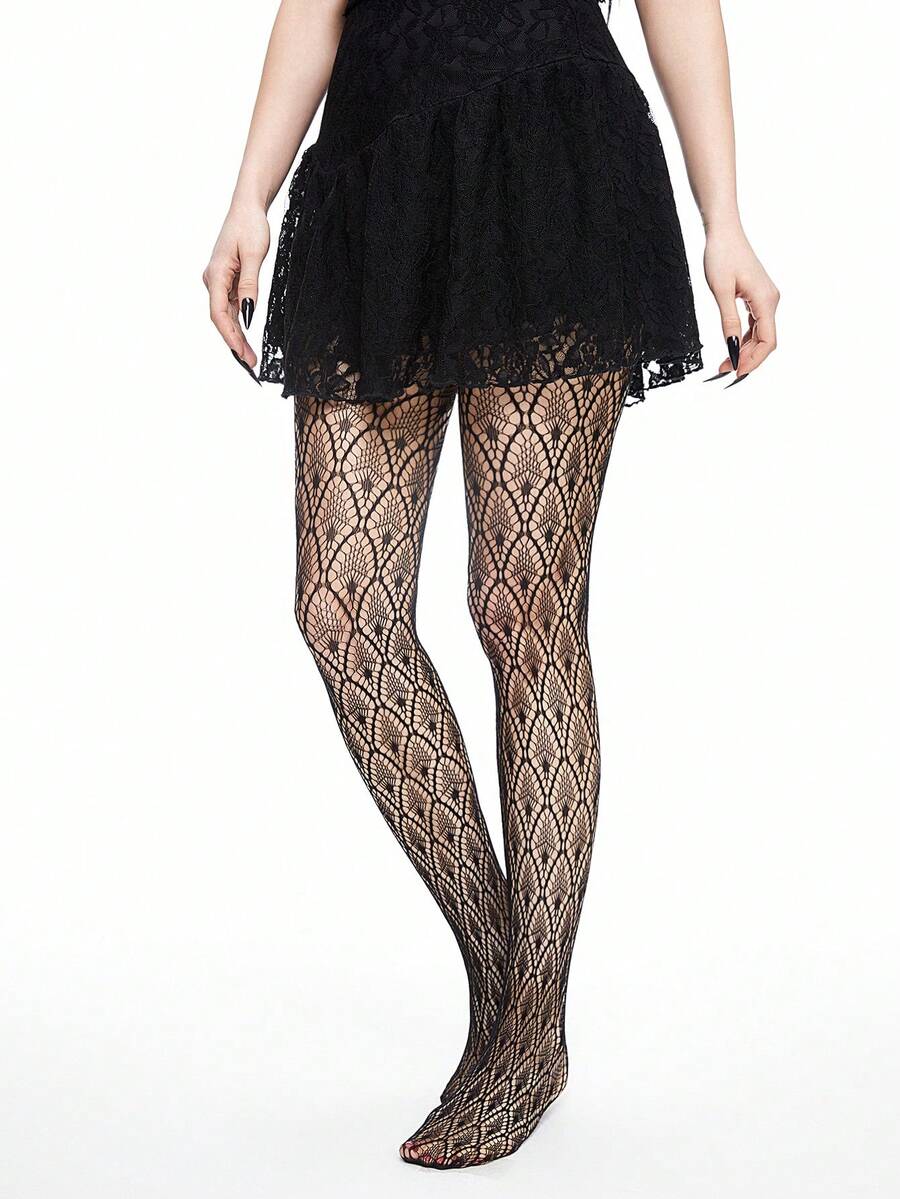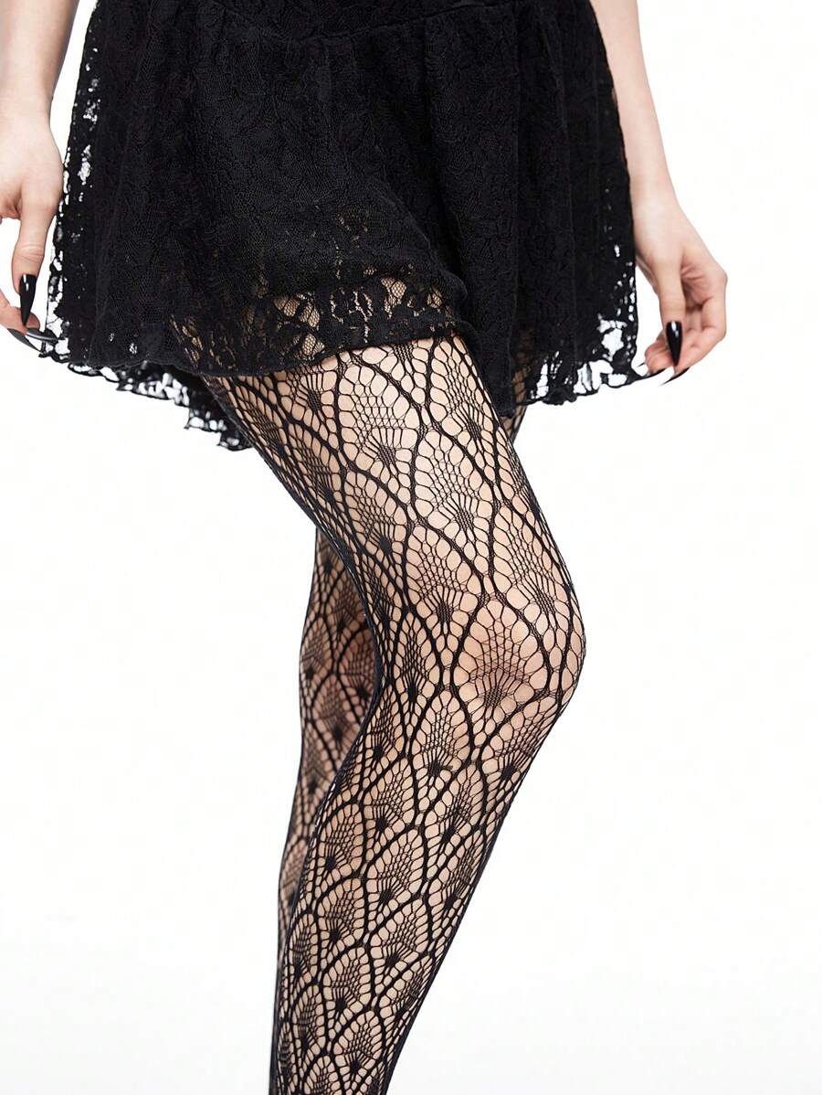 Goth Calze a rete con bretelle in jacquard, Calze a rete a buco grande con motivo unico