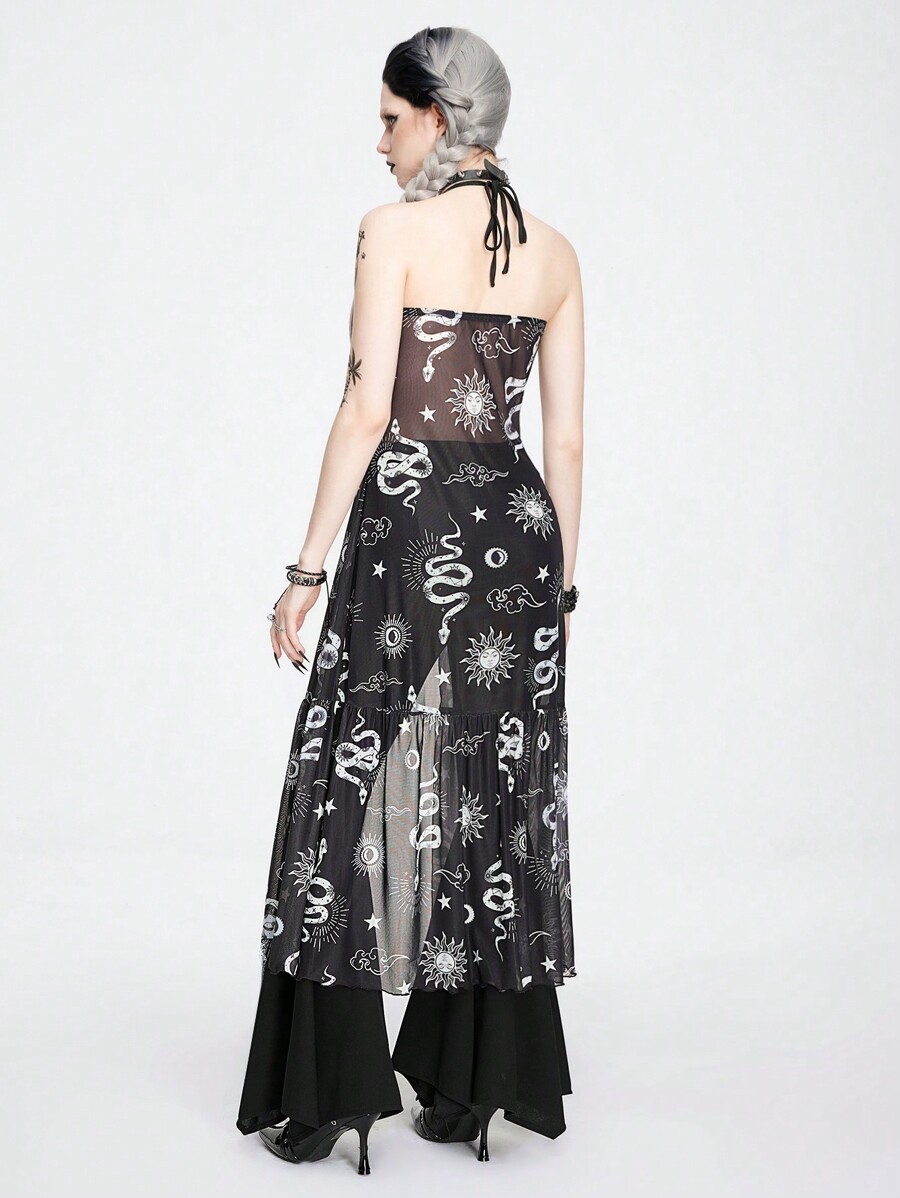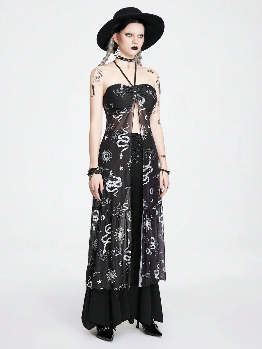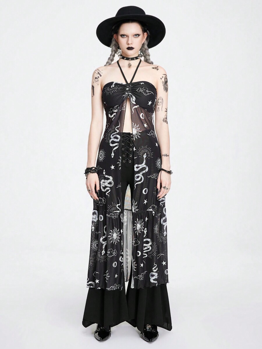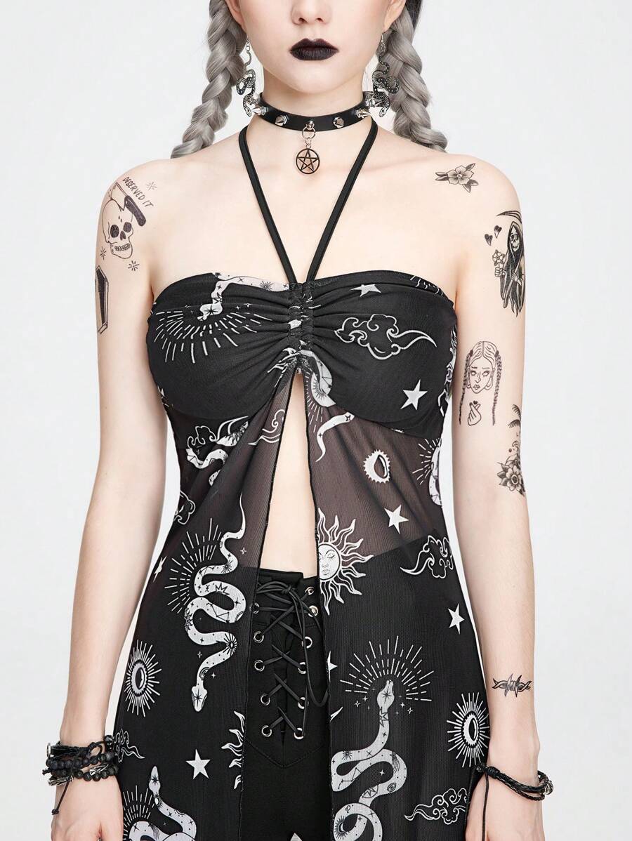 Goth Top Bandeau a collo Halter stampa serpente a mezzaluna stelle a rete per uso casuale e vacanza per signore