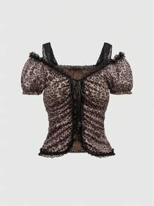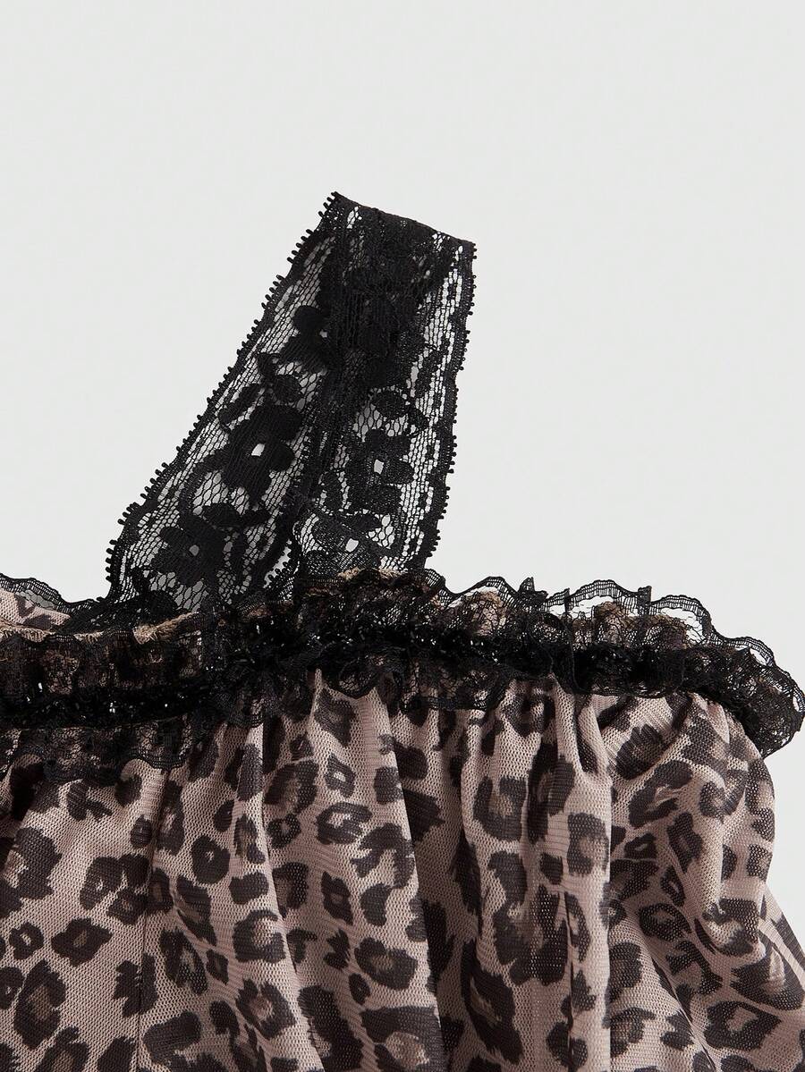 Goth Maglietta donna con rete stampa leopardo, pannello in mesh, top finto cami con pizzo trimmato con lacci sulla vita