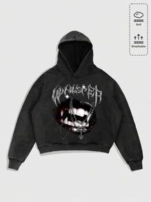 Goth Felpa con cappuccio in pile casual da uomo con stampa di lettere e labbra, adatta per l'autunno