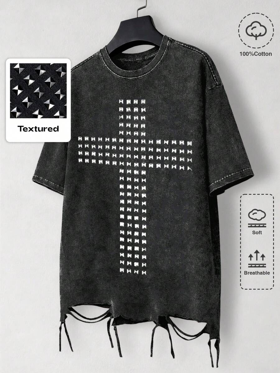Goth maglietta casual a maniche corte da uomo con collo a giro, stampa grafica a croce con borchie e fiocchi di neve