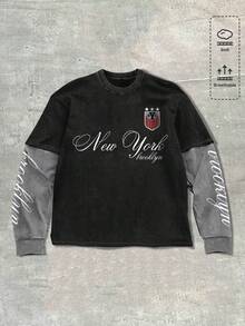 Goth Maglietta casual da uomo a maniche lunghe con stampa di lettere e collo tondo, 2 in 1
