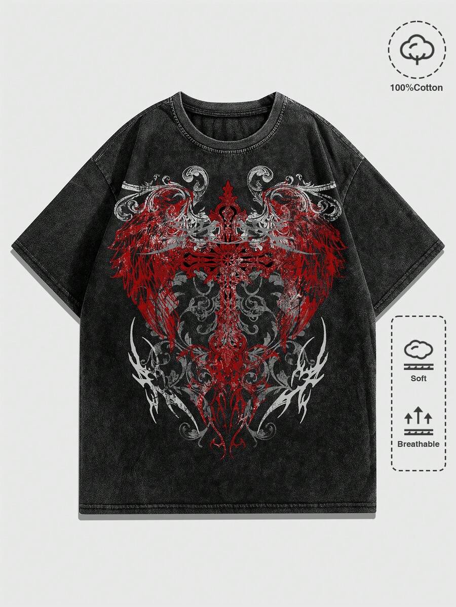 Goth T-shirt casual da uomo a maniche corte, scollo rotondo, con stampa ad ali, versatile per uso quotidiano
