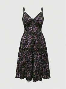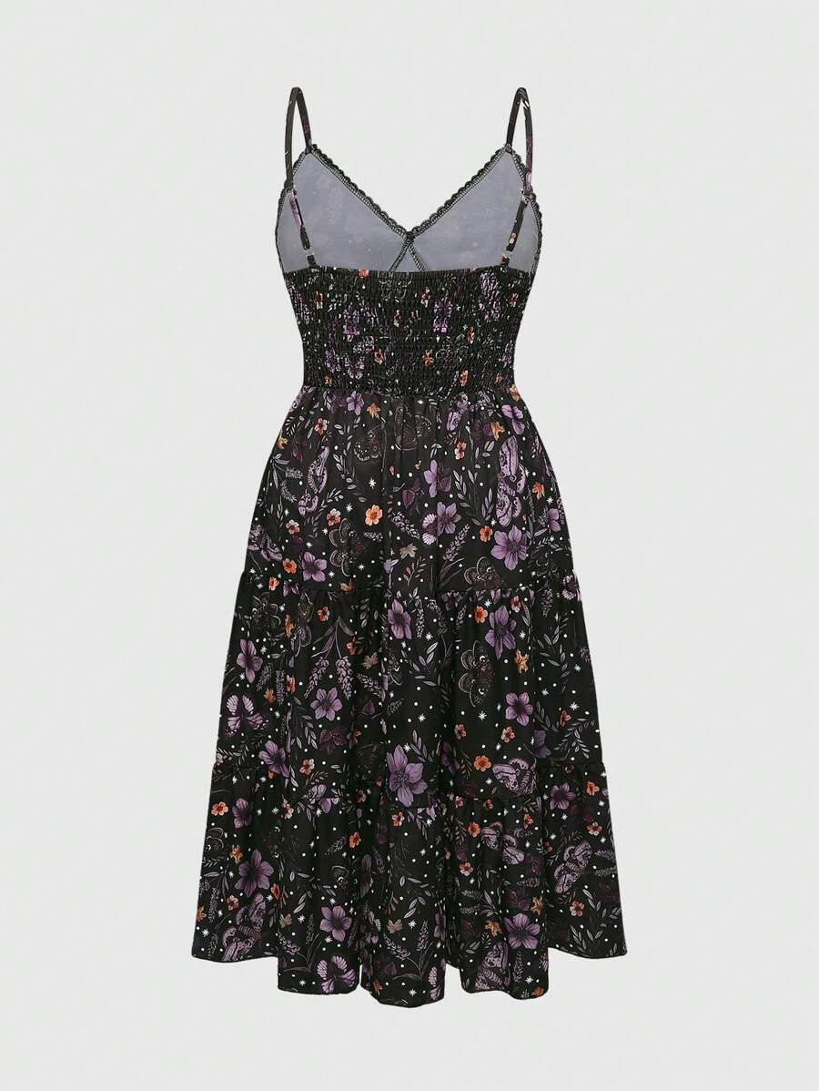 Goth Vestito lungo con taglie comode e stampa floreale completa con falene viola scuro, con bretelle