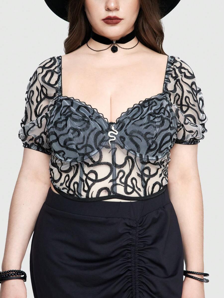Goth Top sexy trasparente taglia forte con motivo serpente ricamato