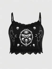 Goth Taglie Forti Top con bretelle sottile con stampa teschi orlo di pizzo
