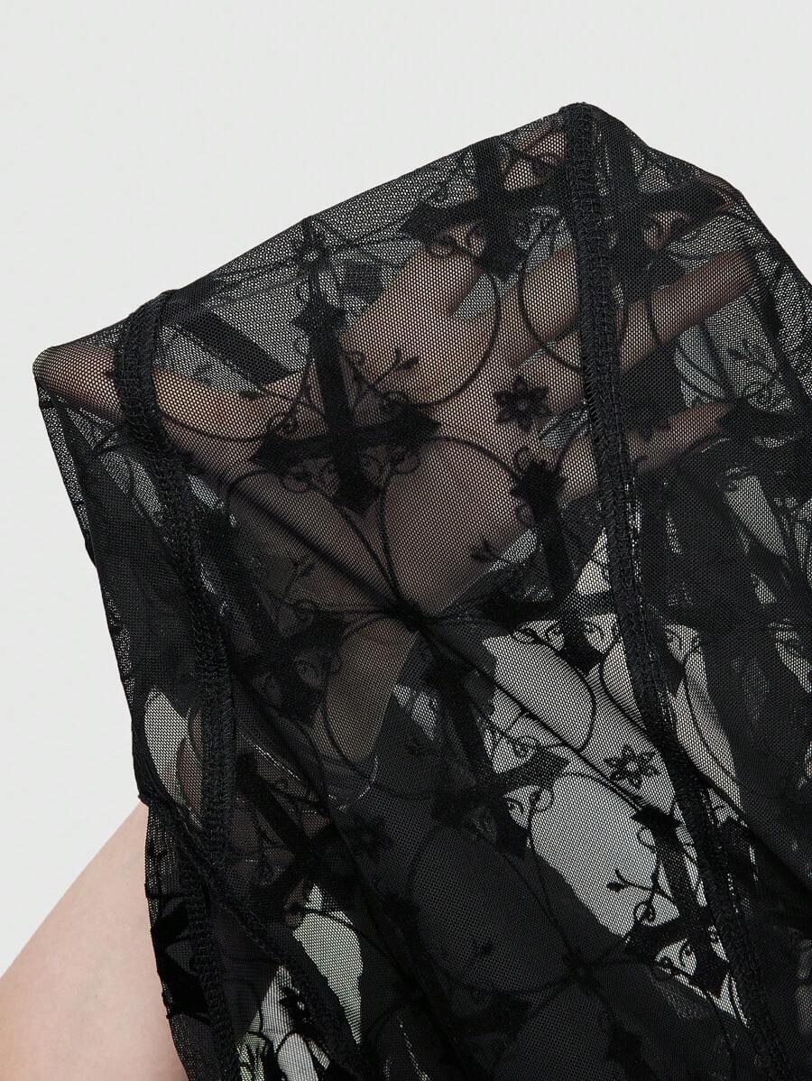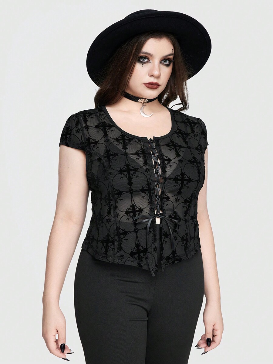 Goth Top asimmetrico per donne taglie forti con apertura anteriore, con decorazione a fiocco, pannello trasparente e dettagli con laccetti, dal design gotico e sexy