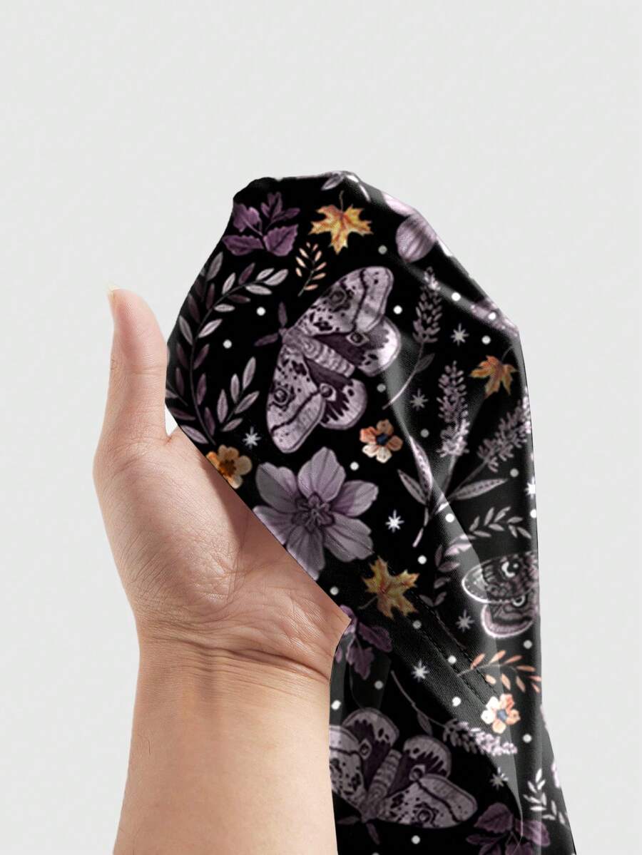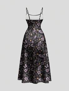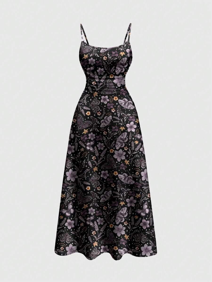 Goth Abito da donna sexy da vacanza con stampa floreale blu e viola, con motivi di sole, luna, stelle e farfalle, con spalline sottili e linea ad A arricciata