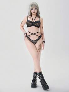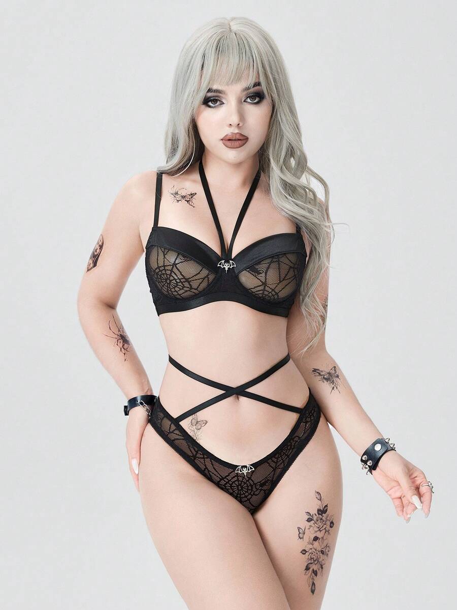 Goth Set di reggiseno con ferretto e perizoma con incrocio sul cavallo, a tema ragnatela gotico, con fibbia a forma di ragno in metallo, lingerie sexy