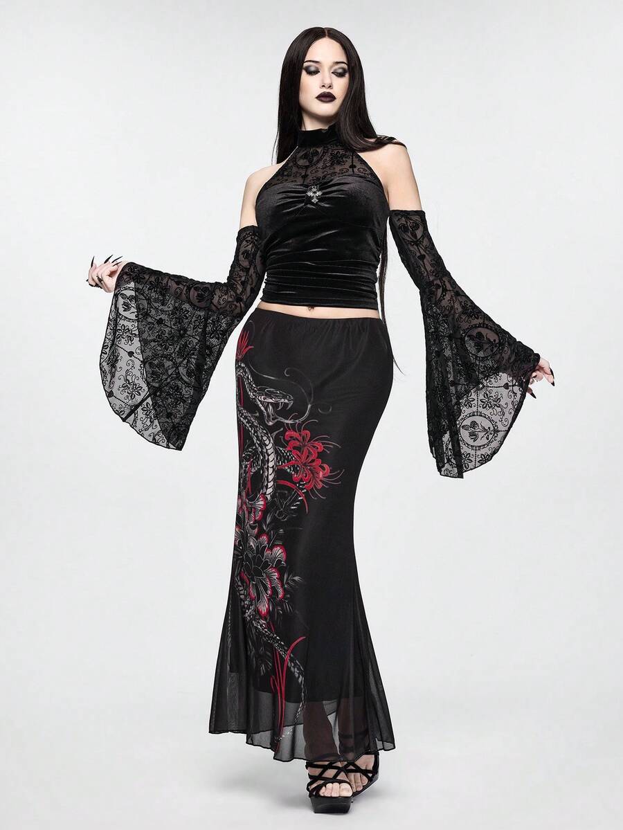 Goth Gonna a sirena aderente con stampa di ibisco e pelle di serpente in stile Dark Academia cinese